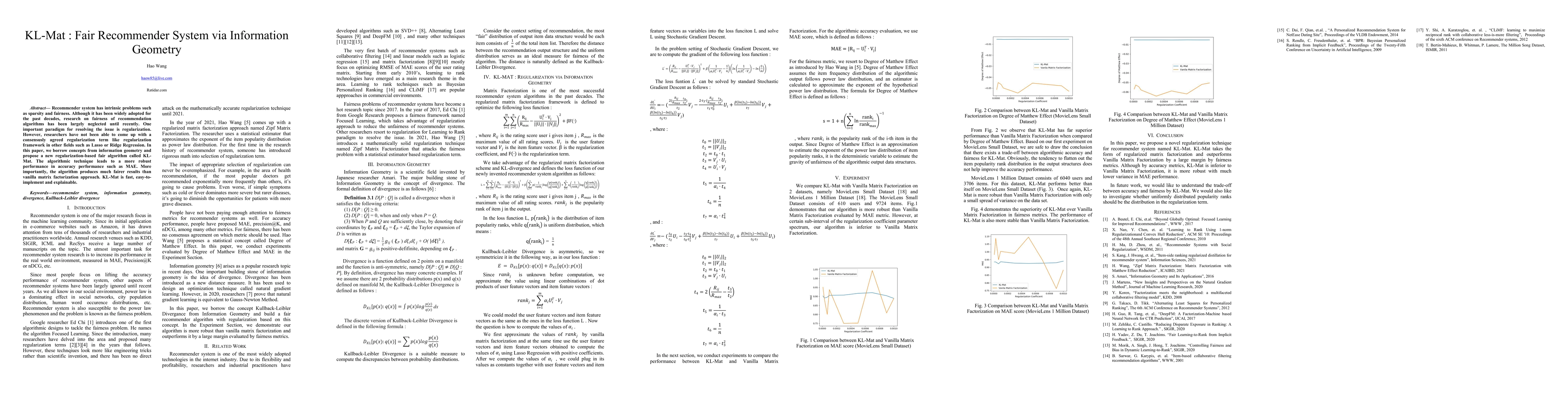 Recommender system has intrinsic problems such as sparsity and fairness. Although it has been widely adopted for the past decades, research on fairness of recommendation algorithms has been largely neglected until recently. One important paradigm for resolving the issue is regularization. However, researchers have not been able to come up with a consensusly agreed regularization term like regularization framework in other fields such as Lasso or Ridge Regression. In this paper, we borrow concepts from information geometry and propose a new regularization-based fair algorithm called KL-Mat. The algorithmic technique leads to a more robust performance in accuracy performance such as MAE. More importantly, the algorithm produces much fairer results than vanilla matrix factorization approach. KL-Mat is fast, easy-to-implement and explainable.