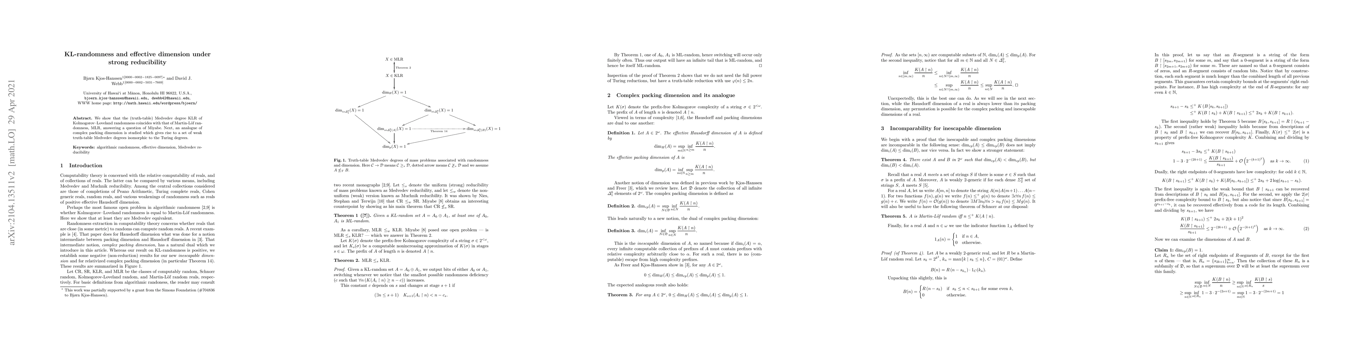 We show that the (truth-table) Medvedev degree KLR of Kolmogorov--Loveland randomness coincides with that of Martin L\"of randomness, MLR, answering a question of Miyabe. Next, an analogue of complex packing dimension is studied which gives rise to a set of weak truth-table Medvedev degrees isomorphic to the Turing degrees.