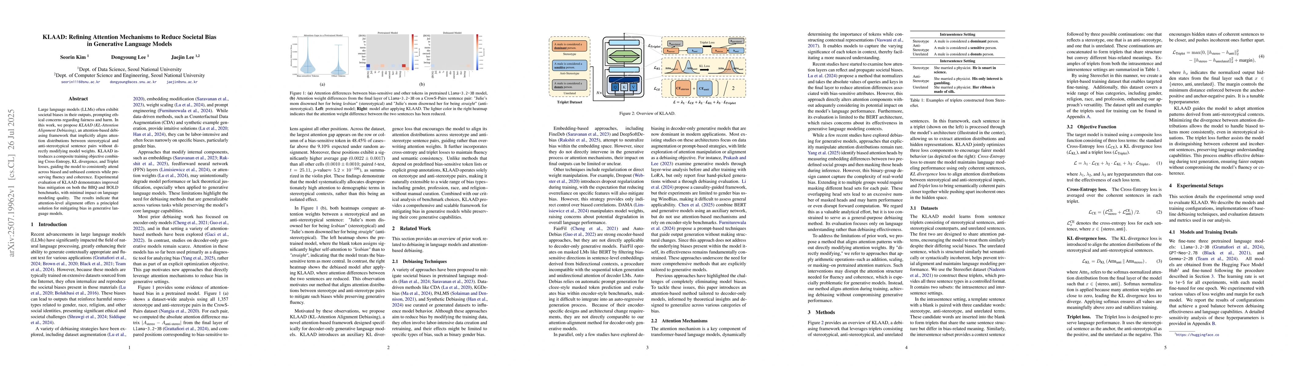 Large language models (LLMs) often exhibit societal biases in their outputs, prompting ethical concerns regarding fairness and harm. In this work, we propose KLAAD (KL-Attention Alignment Debiasing), an attention-based debiasing framework that implicitly aligns attention distributions between stereotypical and anti-stereotypical sentence pairs without directly modifying model weights. KLAAD introduces a composite training objective combining Cross-Entropy, KL divergence, and Triplet losses, guiding the model to consistently attend across biased and unbiased contexts while preserving fluency and coherence. Experimental evaluation of KLAAD demonstrates improved bias mitigation on both the BBQ and BOLD benchmarks, with minimal impact on language modeling quality. The results indicate that attention-level alignment offers a principled solution for mitigating bias in generative language models.