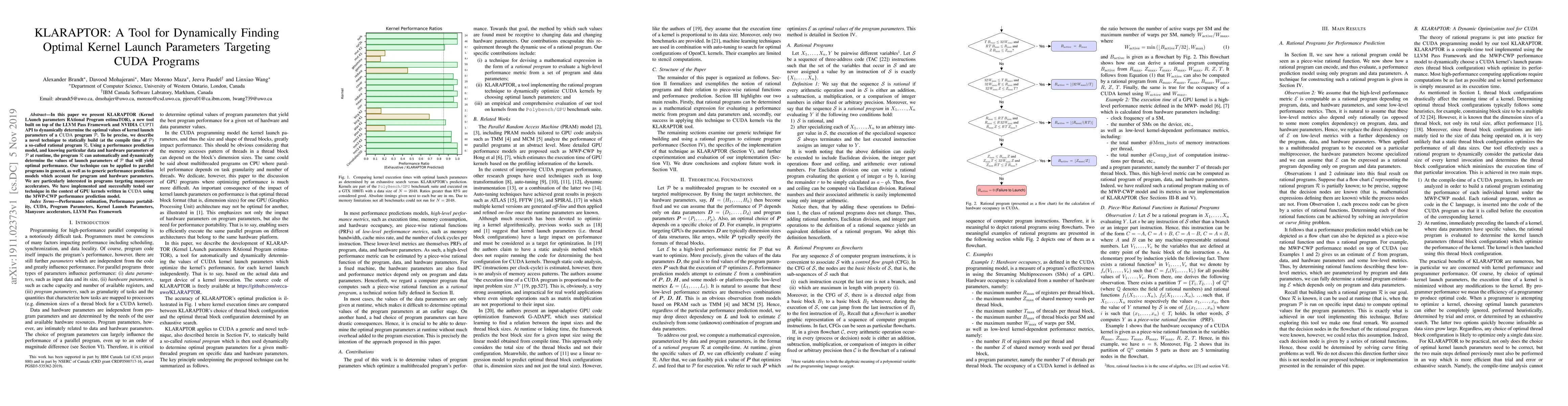 In this paper we present KLARAPTOR (Kernel LAunch parameters RAtional Program estimaTOR), a new tool built on top of the LLVM Pass Framework and NVIDIA CUPTI API to dynamically determine the optimal values of kernel launch parameters of a CUDA program P. To be precise, we describe a novel technique to statically build (at the compile time of P) a so-called rational program R. Using a performance prediction model, and knowing particular data and hardware parameters of P at runtime, the program R can automatically and dynamically determine the values of launch parameters of P that will yield optimal performance. Our technique can be applied to parallel programs in general, as well as to generic performance prediction models which account for program and hardware parameters. We are particularly interested in programs targeting manycore accelerators. We have implemented and successfully tested our technique in the context of GPU kernels written in CUDA using the MWP-CWP performance prediction model.