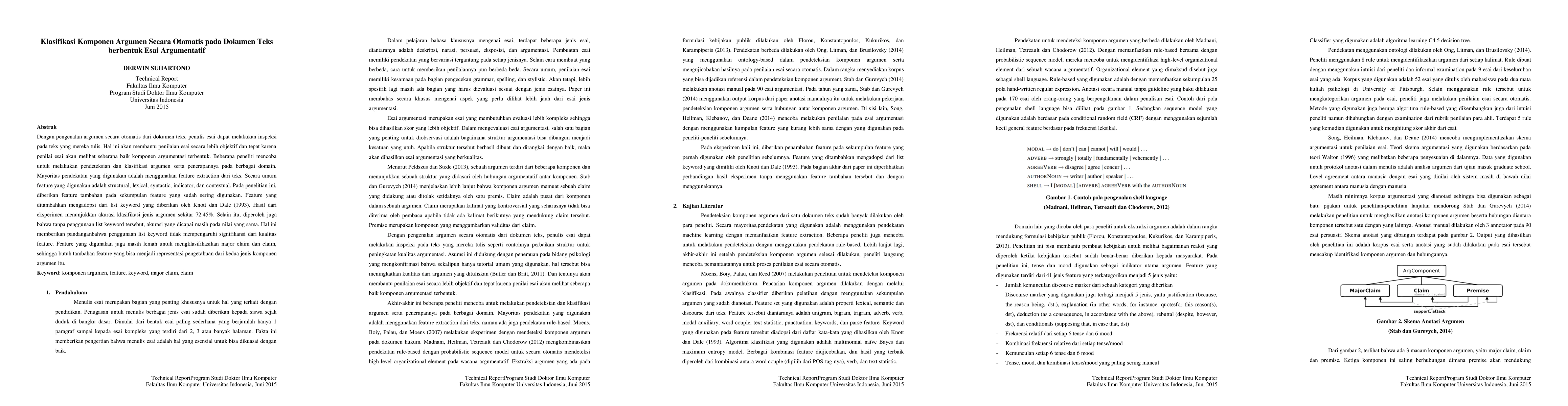 This research paper develops an automated system to classify argument components in essays with 72.45% accuracy, using a combination of existing features and new keyword lists without significant impact on results.