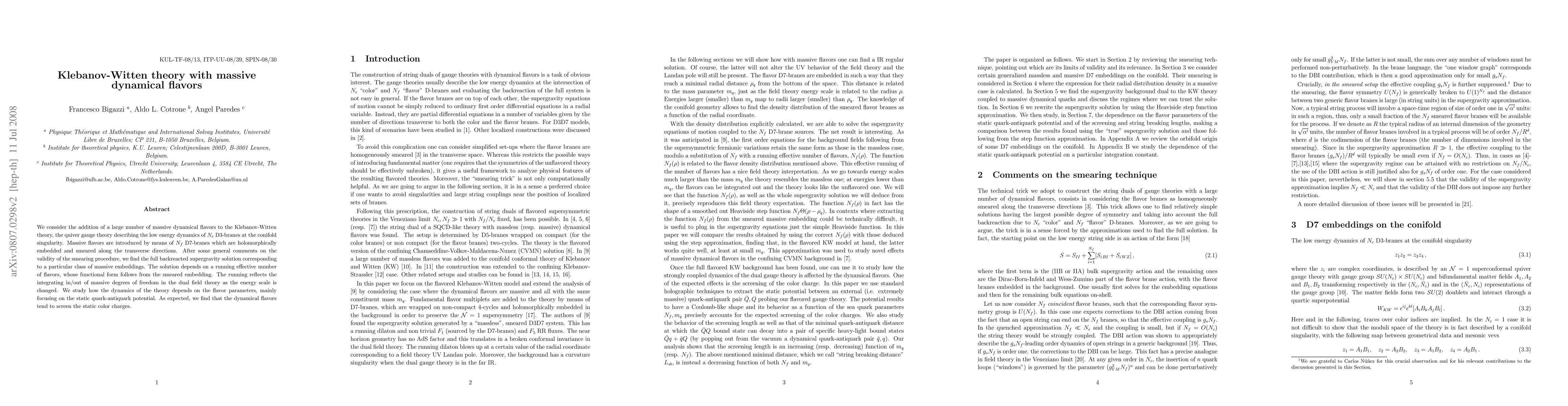 This paper explores the addition of massive dynamical flavors to the Klebanov-Witten theory via Nf D7-branes, finding a backreacted supergravity solution that reflects the integrating in/out of these degrees of freedom. The study focuses on how these flavors screen static color charges, as evidenced by the static quark-antiquark potential.