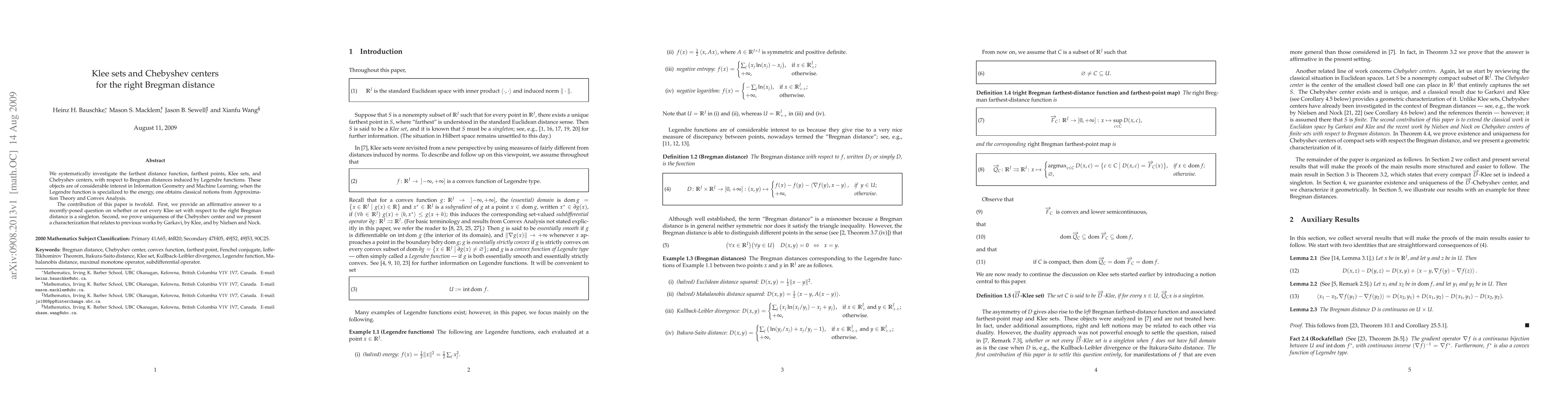 This paper investigates Bregman distances induced by Legendre functions, focusing on farthest distances, Klee sets, and Chebyshev centers. It confirms that every Klee set for the right Bregman distance is a singleton and proves the uniqueness of the Chebyshev center, linking it to classical notions in Approximation Theory and Convex Analysis.