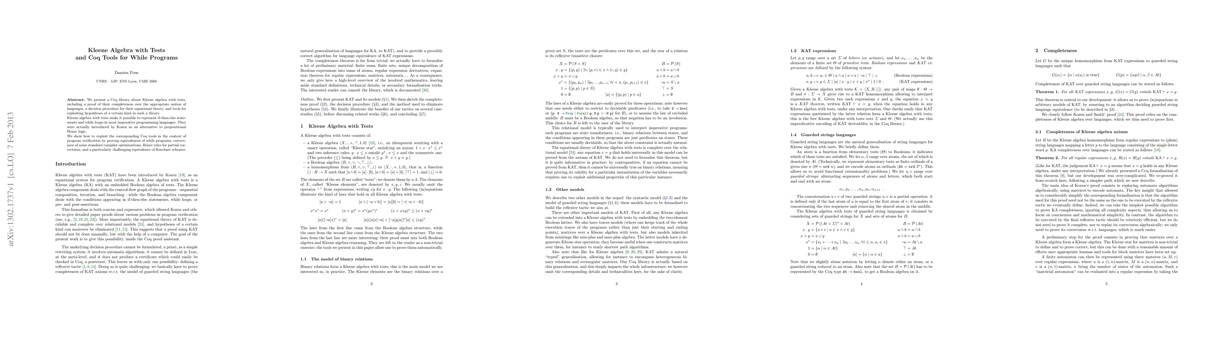This paper introduces a Coq library for Kleene algebra with tests, featuring completeness proofs, equational theory decision procedures, and tools for program verification. The library aids in verifying while programs, compiler optimizations, and partial correctness through Hoare rules.