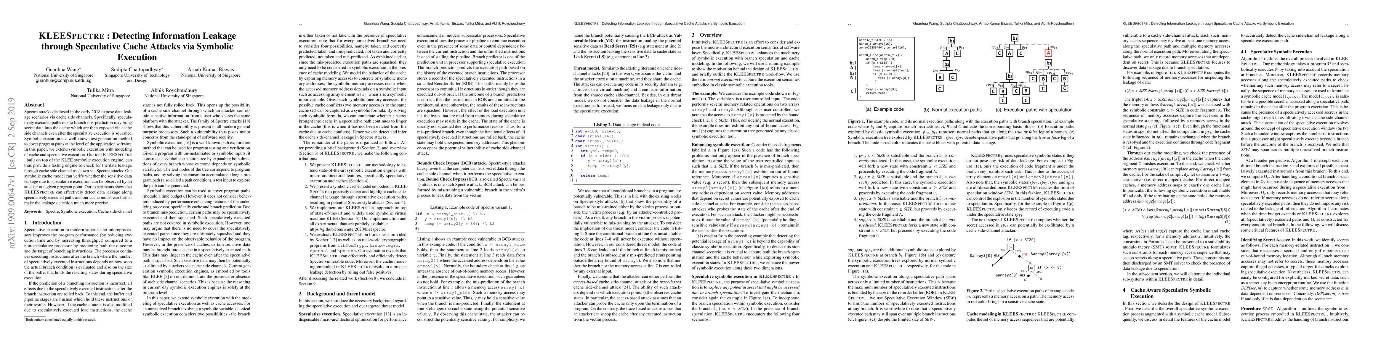 KLEESPECTRE extends symbolic execution to model cache and speculative execution, enabling the detection of data leakage via cache side channels, as seen in Spectre attacks. Experiments demonstrate its effectiveness in precisely identifying sensitive data leakage along speculative paths.