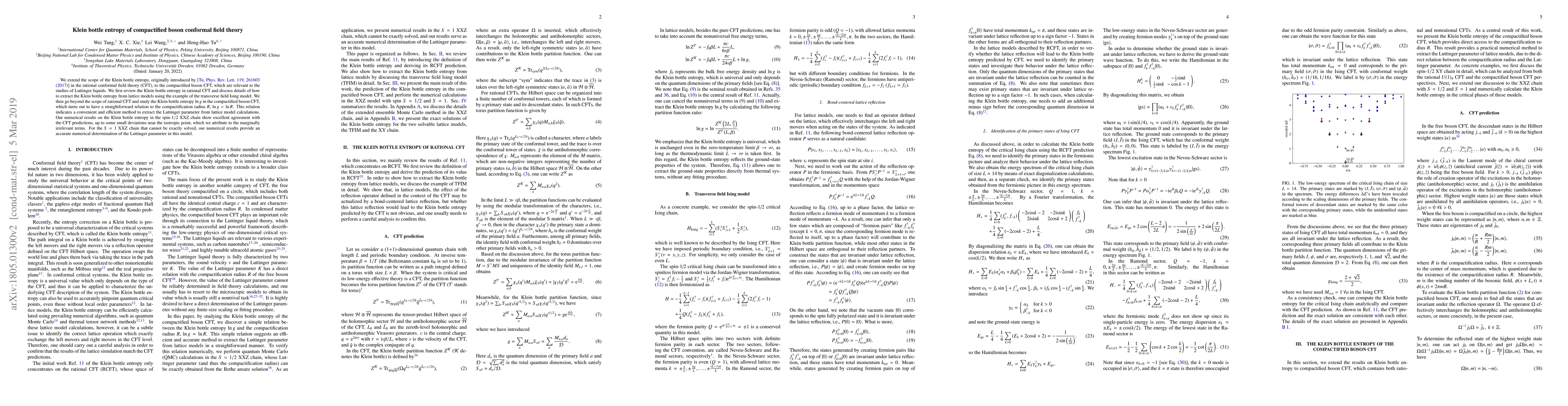 This paper extends the concept of Klein bottle entropy from rational to compactified boson conformal field theory, revealing a direct relationship between $\ln g$ and the compactification radius $R$. Numerical results on the spin-$1/2$ XXZ chain align well with conformal field theory predictions, offering a method to extract the Luttinger parameter from lattice models.