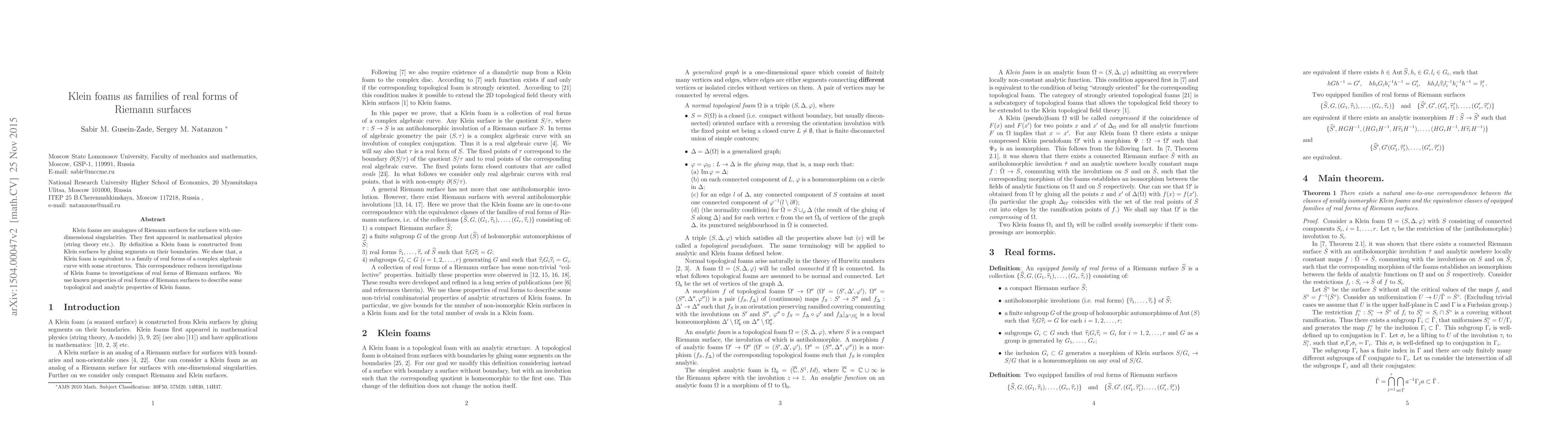 Summary: Klein foams, which are analogues of Riemann surfaces with singularities, are shown to correspond to families of real forms of complex algebraic curves. This correspondence simplifies the study of Klein foams by leveraging known properties of real forms of Riemann surfaces.