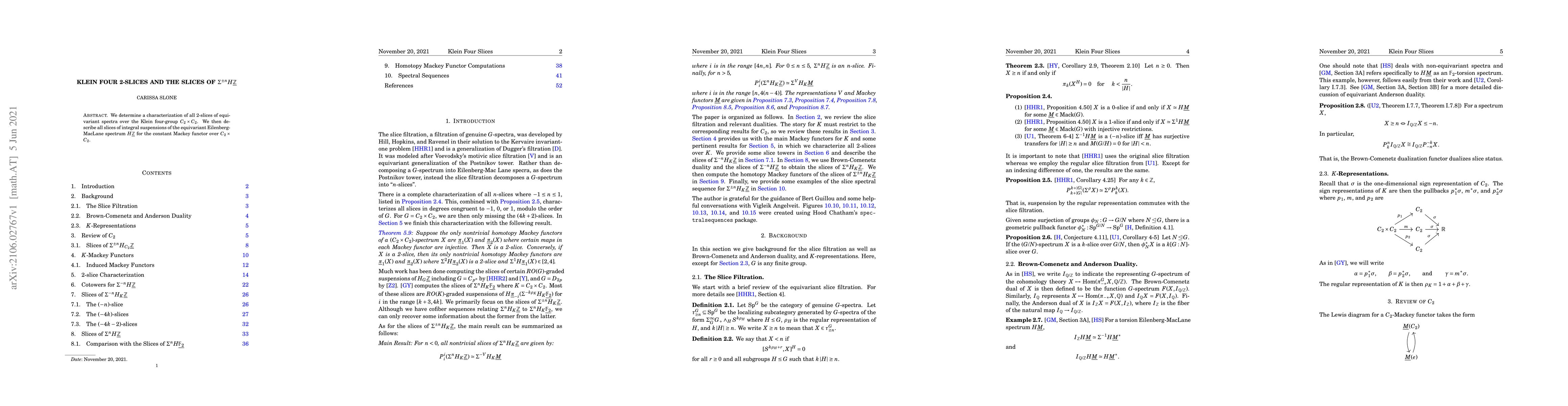 This paper characterizes the 2-slices of equivariant spectra over the Klein four-group $C_2\times C_2$ and identifies all slices of integral suspensions of the equivariant Eilenberg-MacLane spectrum $H\underline{\mathbb{Z}}$ for the constant Mackey functor over $C_2\times C_2$.