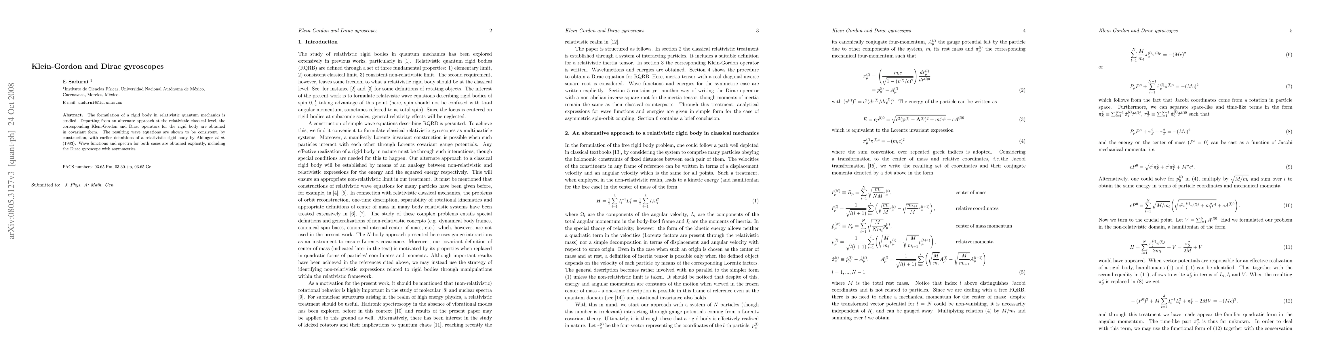 The formulation of a rigid body in relativistic quantum mechanics is studied. Departing from an alternate approach at the relativistic classical level, the corresponding Klein-Gordon and Dirac operators for the rigid body are obtained in covariant form. The resulting wave equations are shown to be consistent, by construction, with earlier definitions of a relativistic rigid body by Aldinger et al (1983). Wave functions and spectra for both cases are obtained explicitly, including the Dirac gyroscope with asymmetries.