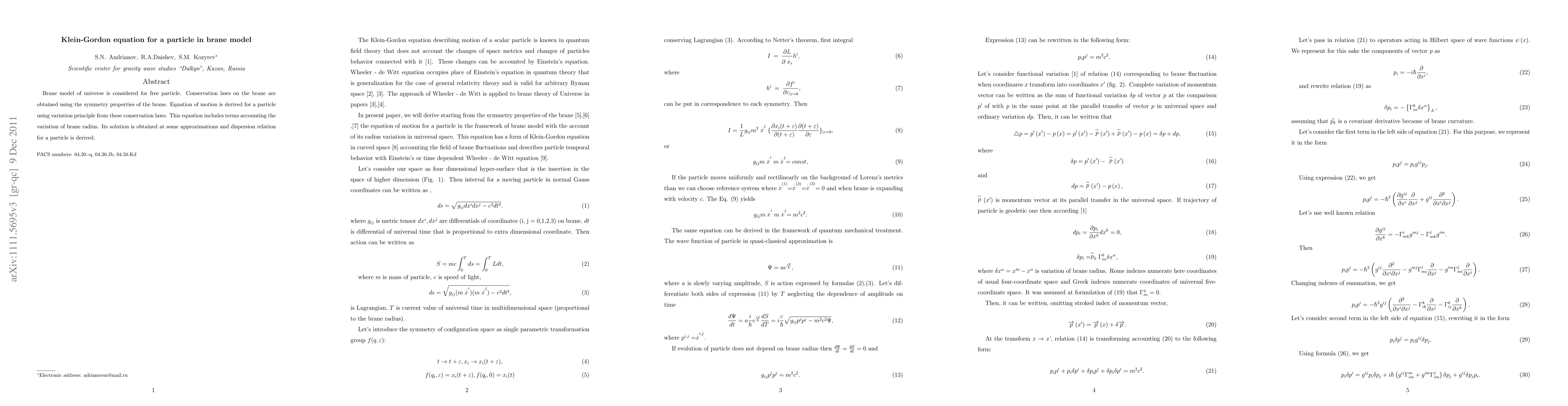 Summary: The paper explores the Klein-Gordon equation for a particle in a brane model, deriving the equation of motion from conservation laws based on brane symmetry properties and solving it under approximations to obtain a dispersion relation that accounts for brane radius variations.