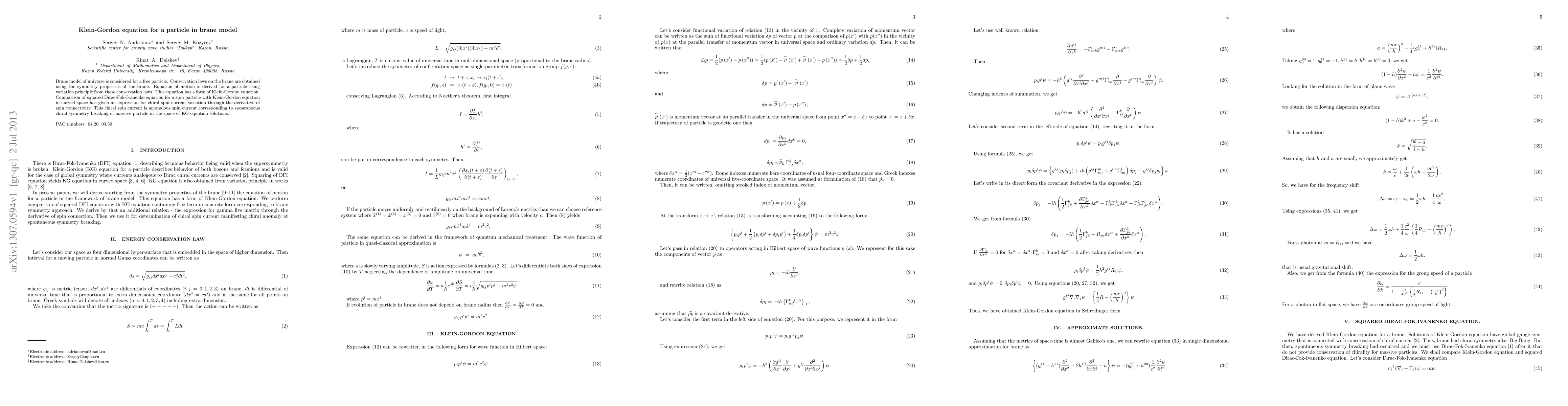 This paper explores the brane model universe for a free particle, deriving the Klein-Gordon equation from conservation laws using symmetry properties. It also investigates the relationship between the Klein-Gordon equation and the squared Dirac-Fok-Ivanenko equation, revealing an anomalous chiral spin current linked to spontaneous chiral symmetry breaking.
