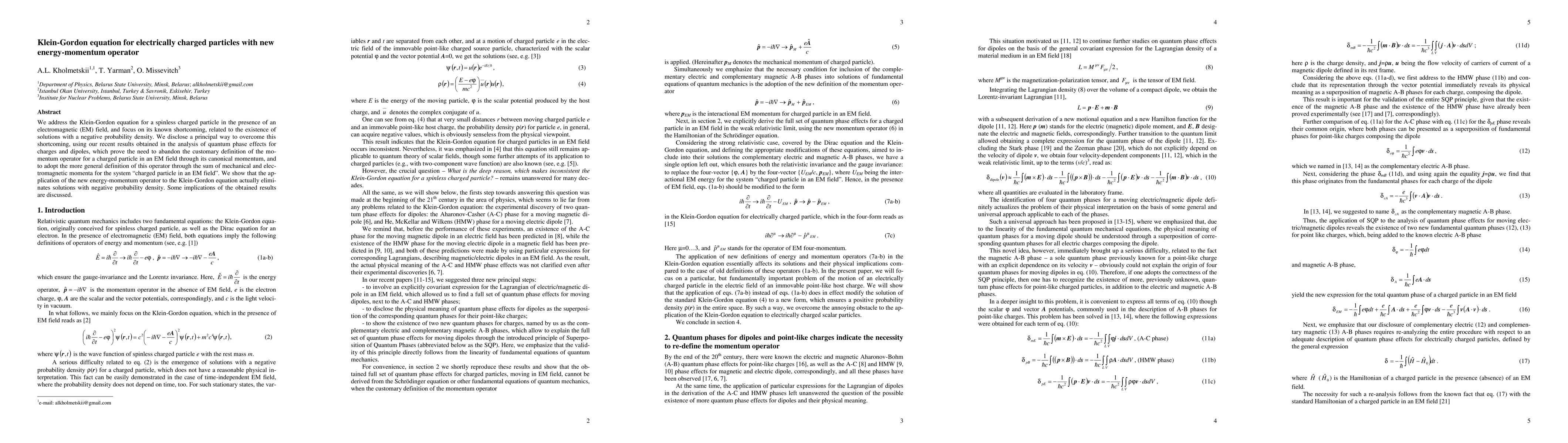 This paper addresses the Klein-Gordon equation for electrically charged particles, proposing a new energy-momentum operator to resolve the issue of negative probability density solutions. The new operator, incorporating both mechanical and electromagnetic momenta, eliminates these problematic solutions.
