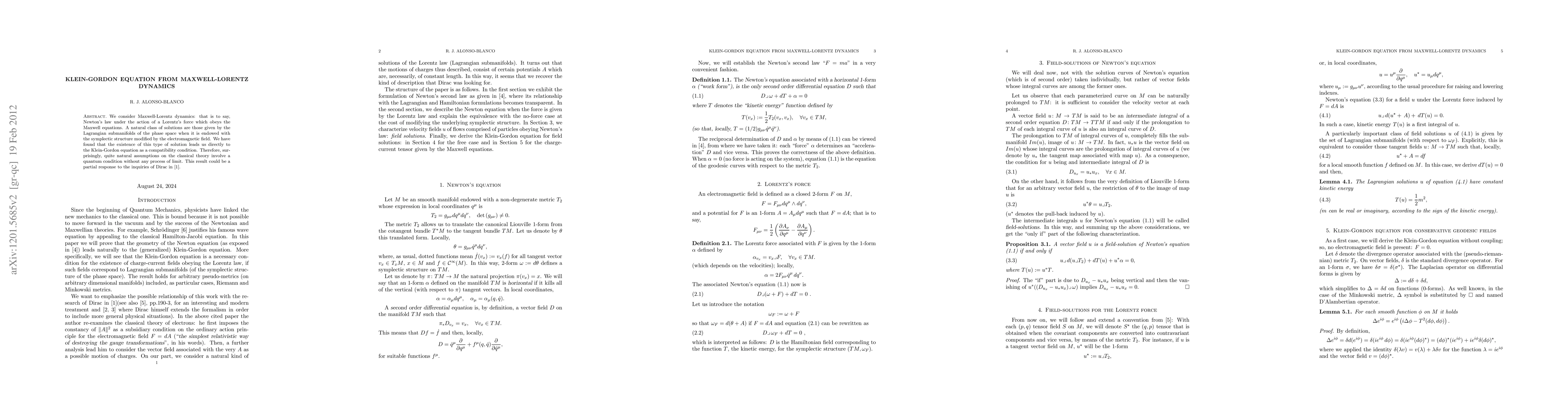 We consider Maxwell-Lorentz dynamics: that is to say, Newton's law under the action of a Lorentz's force which obeys the Maxwell equations. A natural class of solutions are those given by the Lagrangian submanifolds of the phase space when it is endowed with the symplectic structure modified by the electromagnetic field. We have found that the existence of this type of solution leads us directly to the Klein-Gordon equation as a compatibility condition. Therefore, surprisingly, quite natural assumptions on the classical theory involve a quantum condition without any process of limit. This result could be a partial response to the inquiries of Dirac.