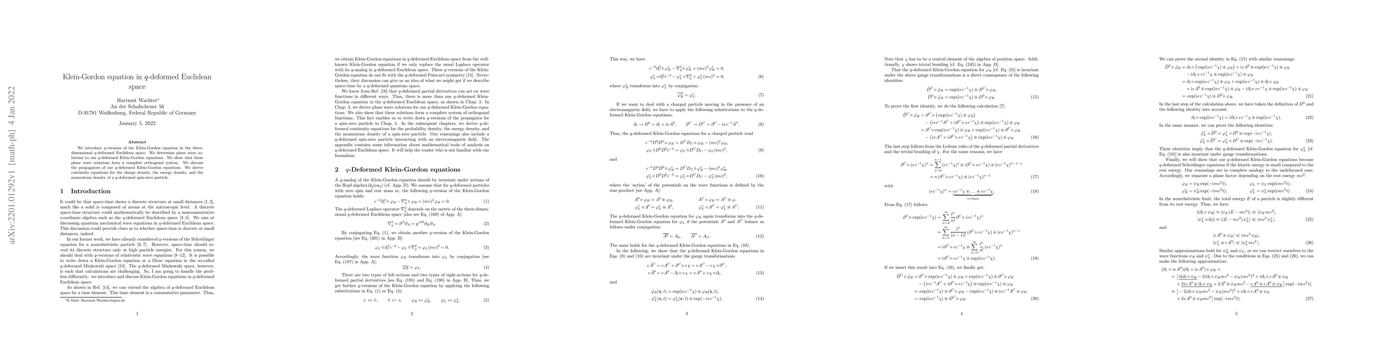 This paper introduces $q$-deformed versions of the Klein-Gordon equation in three-dimensional $q$-deformed Euclidean space, determines plane wave solutions, and shows they form a complete orthogonal system. It also discusses the propagators and derives continuity equations for charge, energy, and momentum densities of a $q$-deformed spin-zero particle.