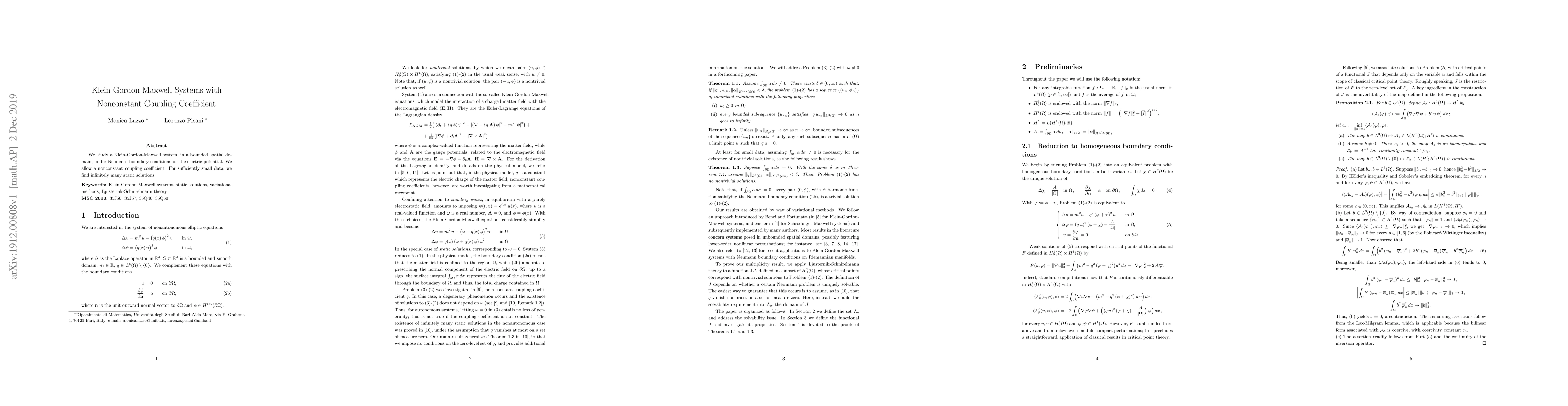 This paper investigates a Klein-Gordon-Maxwell system with a nonconstant coupling coefficient in a bounded spatial domain under Neumann boundary conditions. The authors find infinitely many static solutions for sufficiently small initial data.