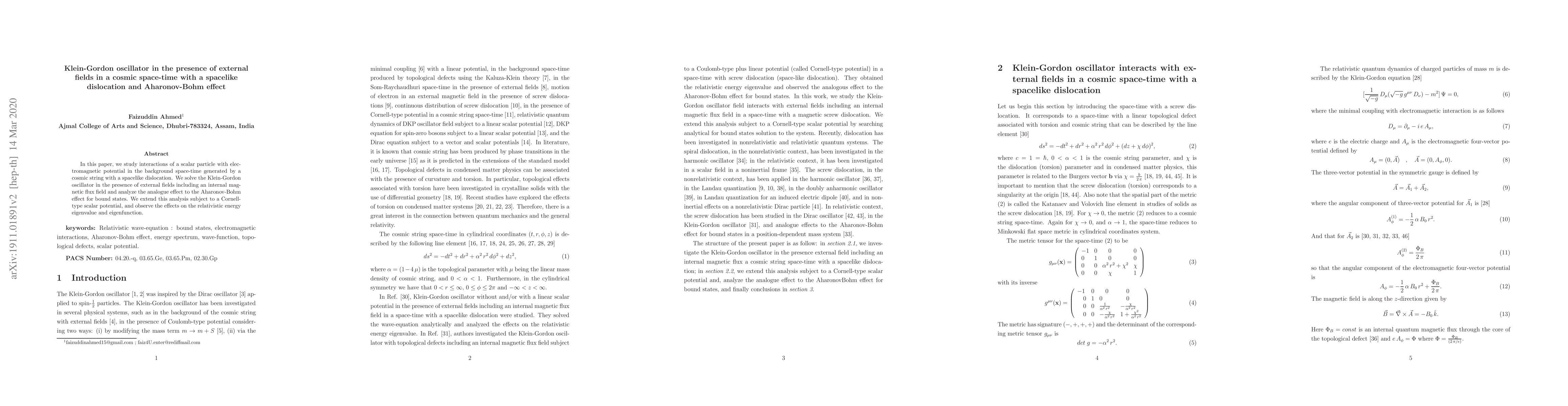 This paper investigates the Klein-Gordon oscillator for a scalar particle in a cosmic space-time with a spacelike dislocation and an Aharonov-Bohm effect, solving for interactions in the presence of external electromagnetic fields and an internal magnetic flux. It extends the analysis to a Cornell-type scalar potential, examining the impact on relativistic energy eigenvalues and eigenfunctions.