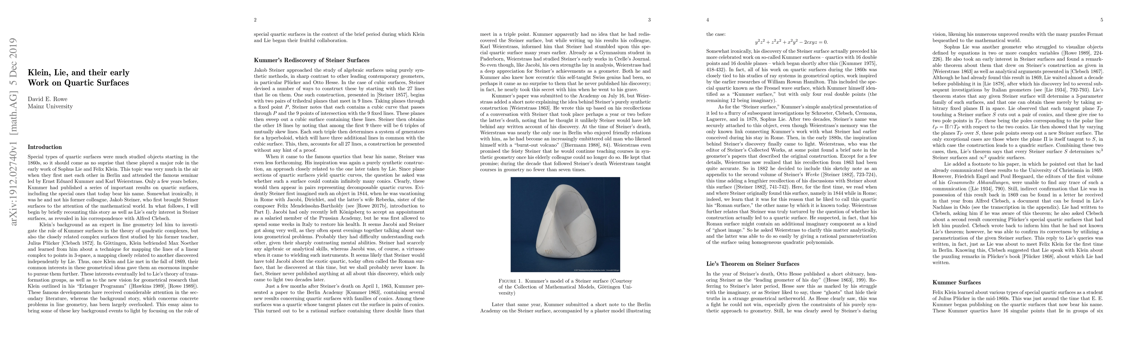 Special types of quartic surfaces were much studied objects during the 1860s. Quartics were thus very much in the air when Sophus Lie and Felix Klein first met in Berlin in 1869. As this study shows, such surfaces played a major role in their subsequent work, much of which centered on linear and quadratic line complexes. This mutual interest led them to a number of new results on the quartic surfaces of Steiner, Pl\"ucker, and Kummer, as well as various types of ruled quartics studied earlier by Cremona. This paper, which draws on unpublished archival sources as well as published work from the period 1869-1872, underscores the importance of this aspect of the early geometrical work of these two famous figures. A highlight was Lie's line-to-sphere transformation, which led to surprising new findings on properties of asymptotic curves on Kummer surfaces.