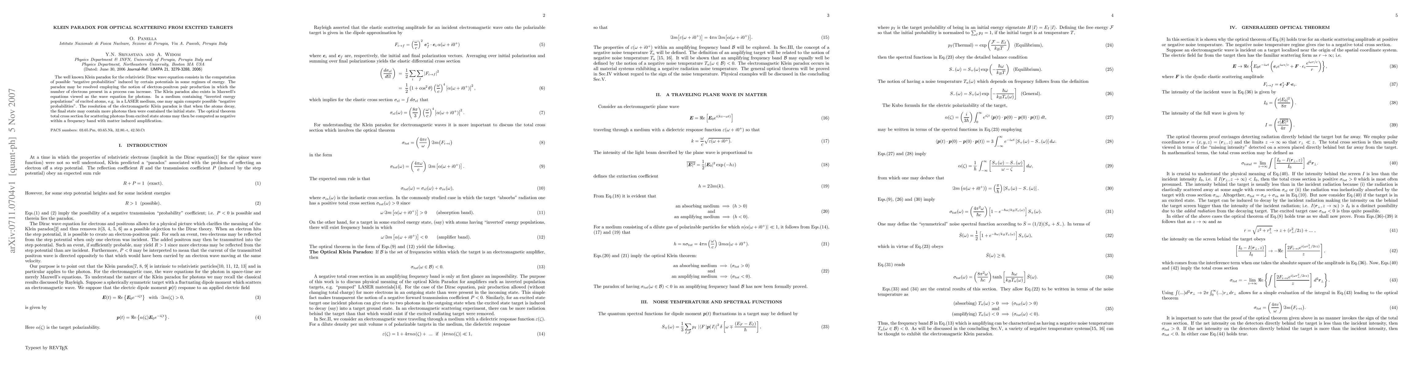 The Klein paradox for optical scattering in excited media involves computing "negative probabilities" due to inverted energy populations, analogous to the relativistic Dirac equation paradox. The paradox is resolved by considering photon amplification during atomic decay, leading to a negative total cross section for scattering within a specific frequency band.