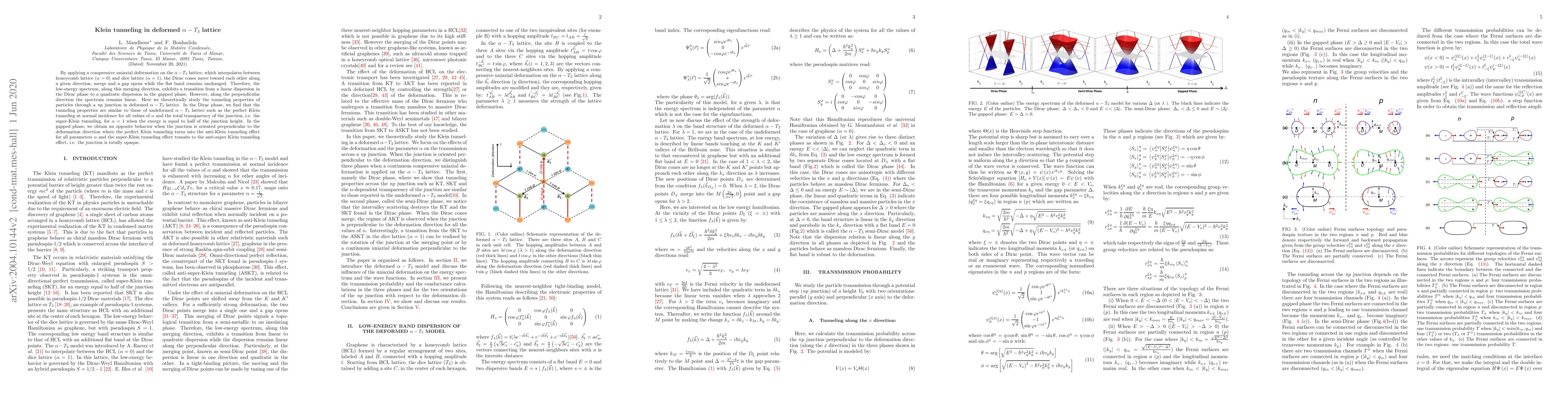 This research investigates Klein tunneling in a deformed $\alpha-T_3$ lattice subjected to uniaxial compression, noting a transition from linear to quadratic dispersion in the low-energy spectrum. The study finds that in the Dirac phase, the lattice maintains perfect Klein tunneling properties, while in the gapped phase, the tunneling behavior reverses, showing anti-Klein tunneling and anti-super Klein tunneling effects perpendicular to the deformation direction.