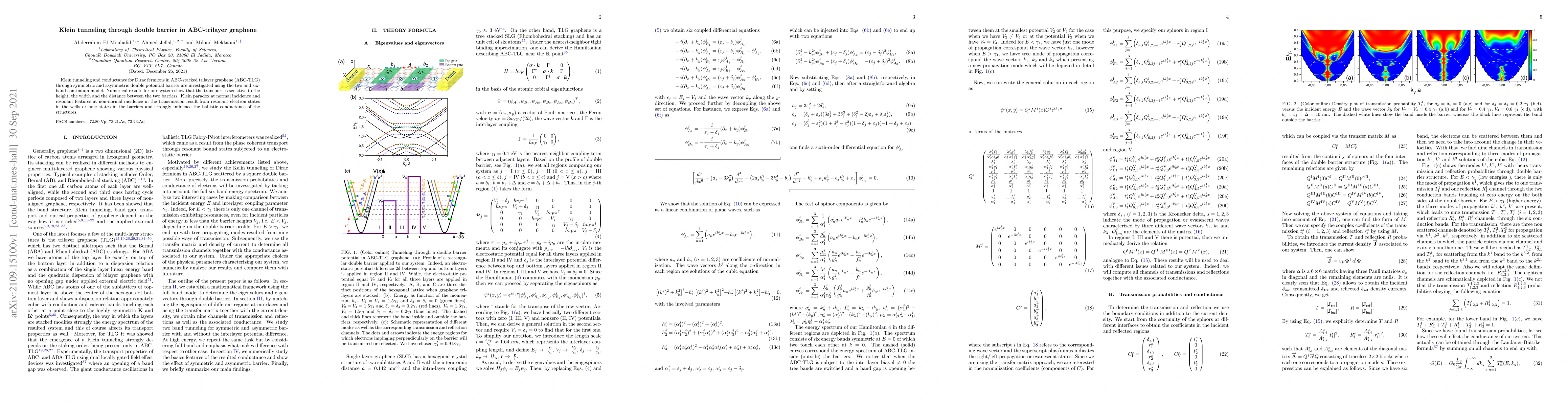 This study investigates Klein tunneling in ABC-stacked trilayer graphene through symmetric and asymmetric double barriers using a two and six-band continuum model. The results reveal that transport properties are significantly influenced by the barrier's height, width, and distance, with Klein paradox and resonant features affecting ballistic conductance.