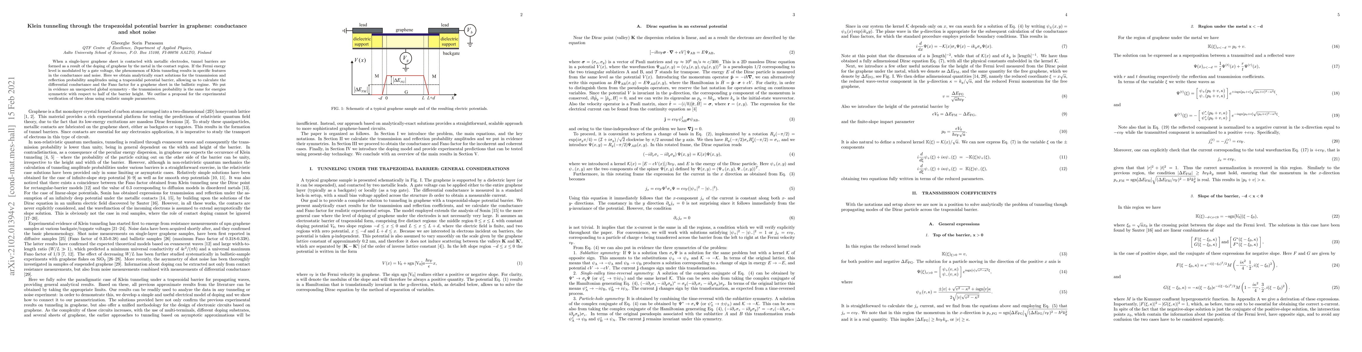 When a single-layer graphene sheet is contacted with metallic electrodes, tunnel barriers are formed as a result of the doping of graphene by the metal in the contact region. If the Fermi energy level is modulated by a gate voltage, the phenomenon of Klein tunneling results in specific features in the conductance and noise. Here we obtain analytically exact solutions for the transmission and reflection probability amplitudes using a trapezoidal potential barrier, allowing us to calculate the differential conductance and the Fano factor for a graphene sheet in the ballistic regime. We put in evidence an unexpected global symmetry - the transmission probability is the same for energies symmetric with respect to half of the barrier height. We outline a proposal for the experimental verification of these ideas using realistic sample parameters.