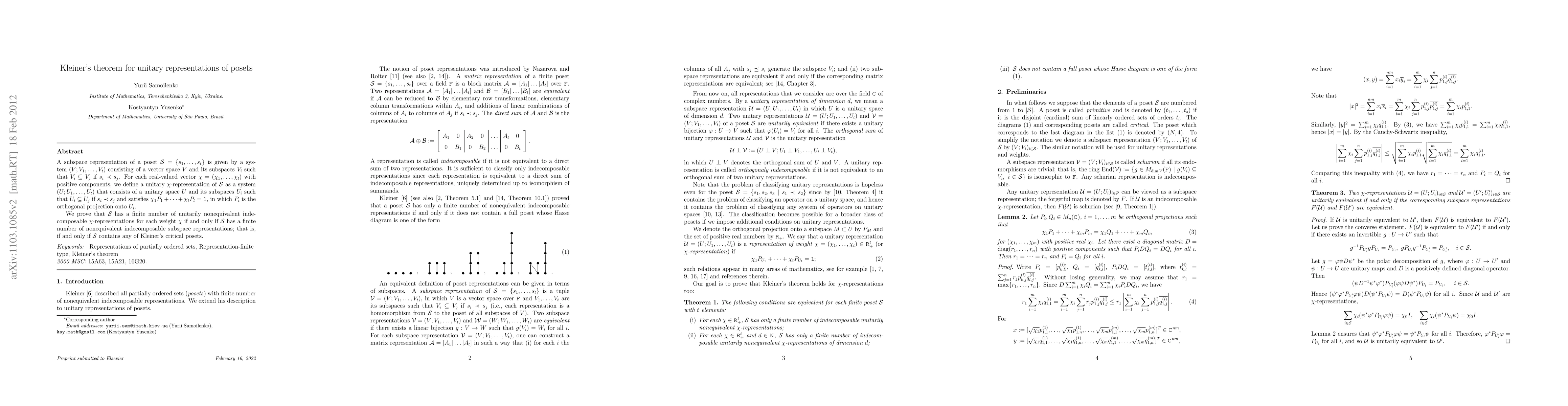 This paper proves Kleiner's theorem for unitary representations of posets, showing that a poset $\mathcal S$ has a finite number of unitarily nonequivalent indecomposable representations if and only if it has a finite number of nonequivalent indecomposable subspace representations, implying the presence of Kleiner's critical posets.