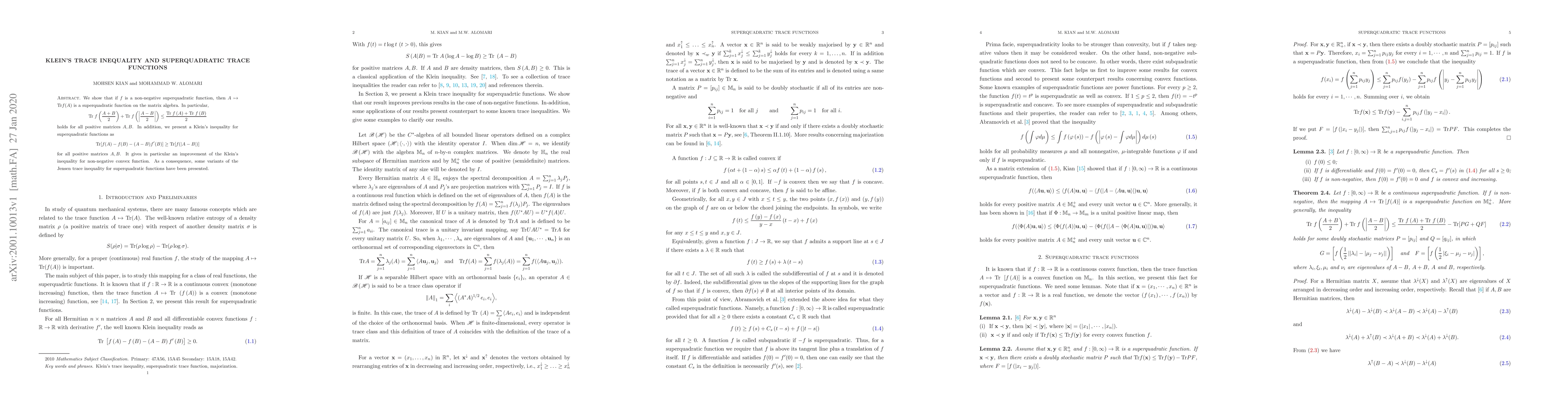 A paper proving a trace inequality for non-negative superquadratic functions on matrix algebra, with implications for the Jensen trace inequality.