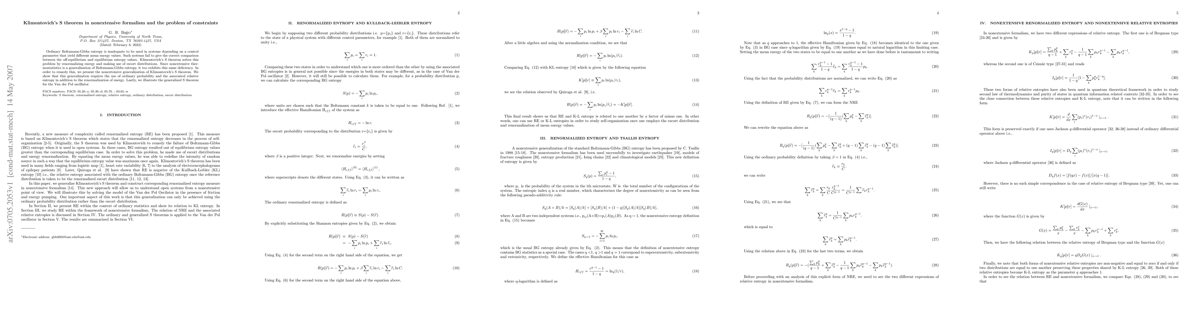 Ordinary Boltzmann-Gibbs entropy is inadequate to be used in systems depending on a control parameter that yield different mean energy values. Such systems fail to give the correct comparison between the off-equilibrium and equilibrium entropy values. Klimontovich's S theorem solves this problem by renormalizing energy and making use of escort distributions. Since nonextensive thermostatistics is a generalization of Boltzmann-Gibbs entropy, it too exhibits this same deficiency. In order to remedy this, we present the nonextensive generalization of Klimontovich's S theorem. We show that this generalization requires the use of ordinary probability and the associated relative entropy in addition to the renormalization of energy. Lastly, we illustrate the generalized S theorem for the Van der Pol oscillator.