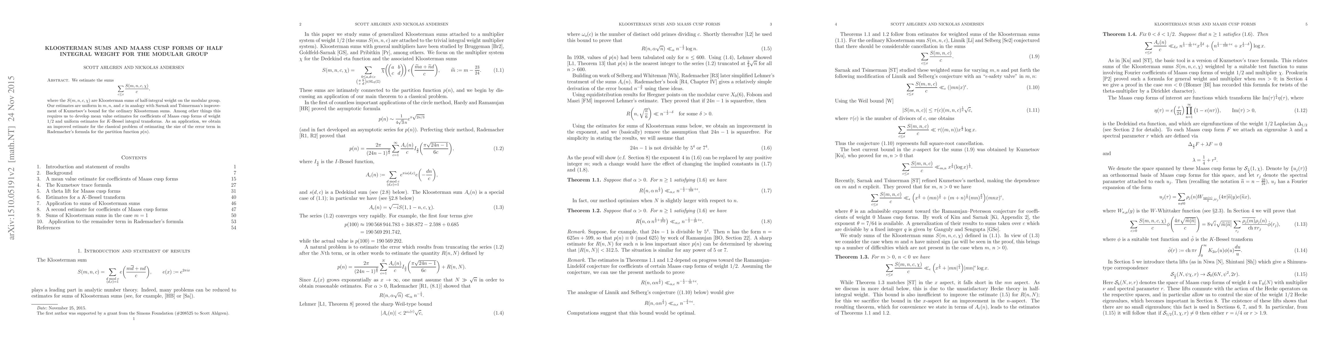 This paper estimates the sums involving Kloosterman sums of half-integral weight on the modular group, developing mean value estimates for coefficients of Maass cusp forms of weight $1/2$ and uniform estimates for $K$-Bessel integral transforms. The results improve the understanding of error terms in Rademacher's formula for the partition function $p(n)$.