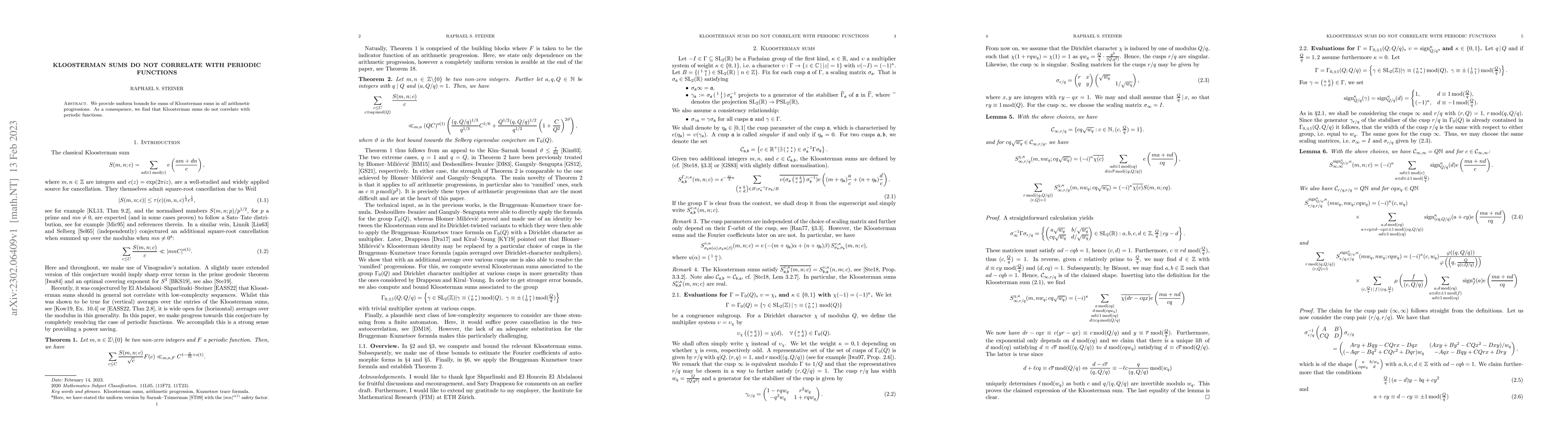 Summary: The paper establishes uniform bounds for Kloosterman sums across arithmetic progressions and demonstrates that these sums do not correlate with periodic functions. This result sheds light on the lack of interaction between Kloosterman sums and periodic functions.