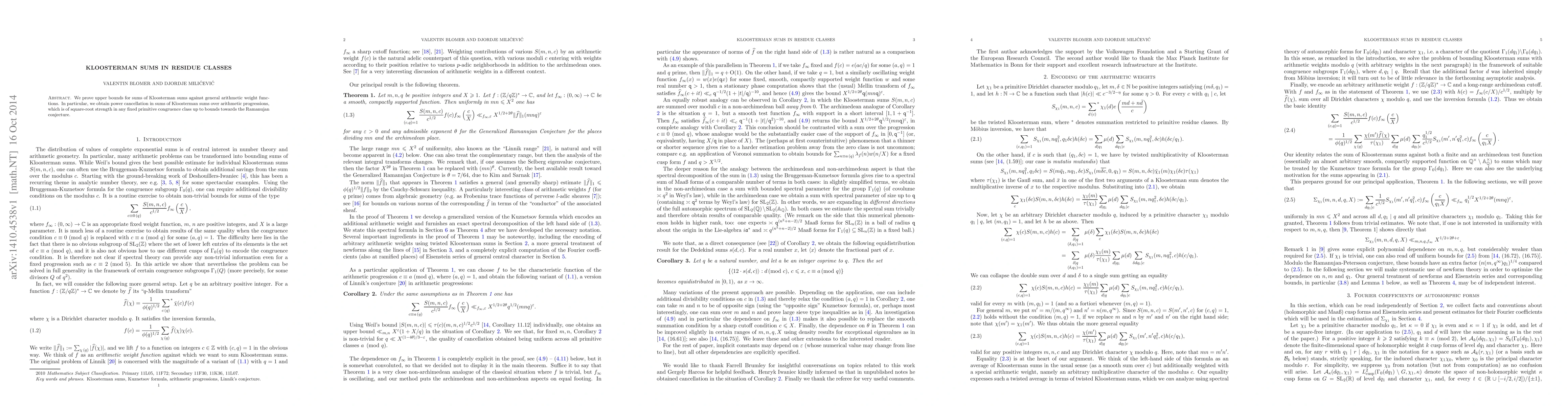 We prove upper bounds for sums of Kloosterman sums against general arithmetic weight functions. In particular, we obtain power cancellation in sums of Kloosterman sums over arithmetic progressions, which is of square-root strength in any fixed primitive congruence class up to bounds towards the Ramanujan conjecture.