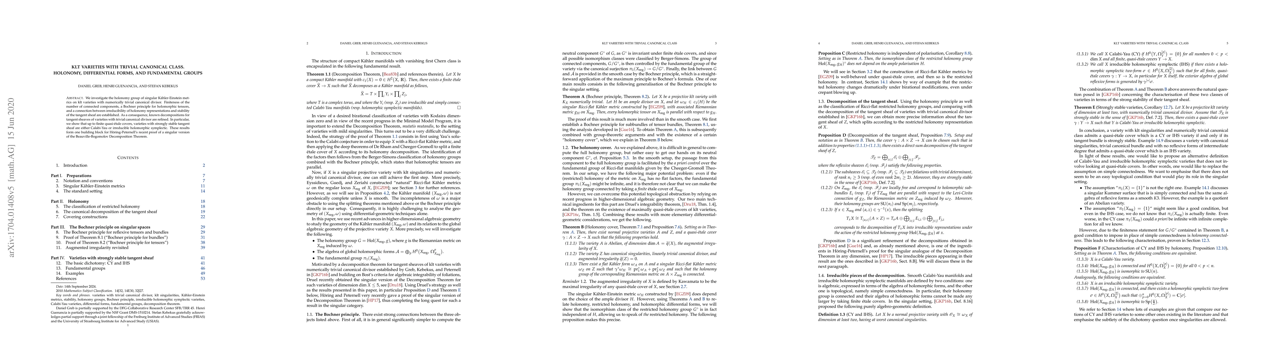 This paper explores the holonomy group of Kähler-Einstein metrics on klt varieties with numerically trivial canonical divisors, establishing finiteness of connected components and connections to the stability of the tangent sheaf. It refines known decompositions and shows that, up to finite quasi-étale covers, varieties with stable tangent sheaves are either Calabi-Yau or irreducible holomorphic symplectic.