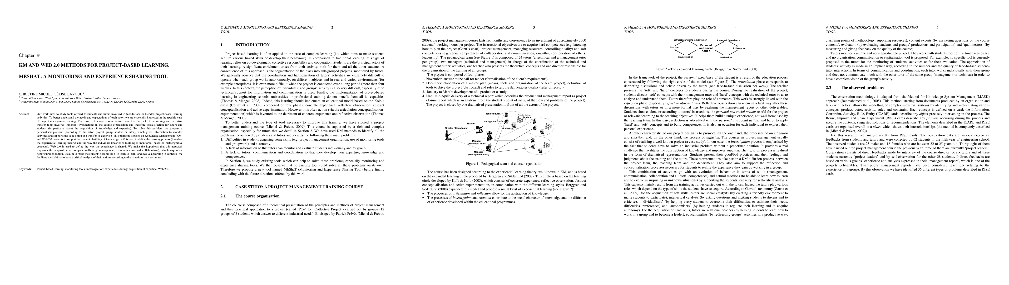 Our work aims at studying tools offered to learners and tutors involved in face-to-face or blended project-based learning activities. To understand better the needs and expectations of each actor, we are especially interested in the specific case of project management training. The results of a course observation show that the lack of monitoring and expertise transfer tools involves important dysfunctions in the course organisation and therefore dissatisfaction for tutors and students (in particular about the acquisition of knowledge and expertise). So as to solve this problem, we propose a personalised platform (according to the actor: project group, student or tutor), which gives information to monitor activities and supports the acquisition and transfer of expertise. This platform is based on Knowledge Management (KM) and Web 2.0 concepts to support the dynamic building of knowledge. KM is used to define the learning process (based on the experiential learning theory) and the way the individual knowledge building is monitored (based on metacognitive concepts). Web 2.0 is used to define the way the experience is shared. We make the hypothesis that this approach improves the acquisition of complex skills (e.g. management, communication and collaboration), which requires a behavioural evolution. We aim at making the students become able 'to learn to learn' and evolve according to contexts. We facilitate their ability to have a critical analysis of their actions according to the situations they encounter.