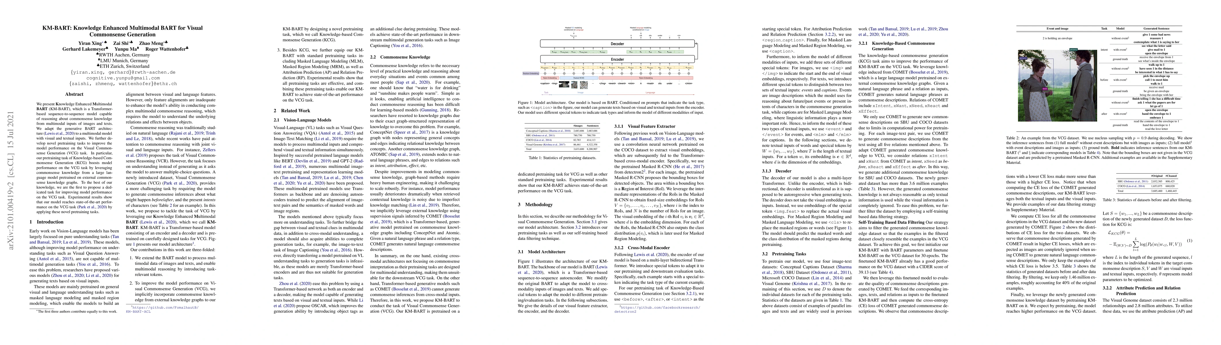 KM-BART is a Transformer-based multimodal model that enhances BART for generating visual commonsense from image and text inputs. It employs a new Knowledge-based Commonsense Generation pretraining task to improve performance on the Visual Commonsense Generation task, achieving state-of-the-art results.