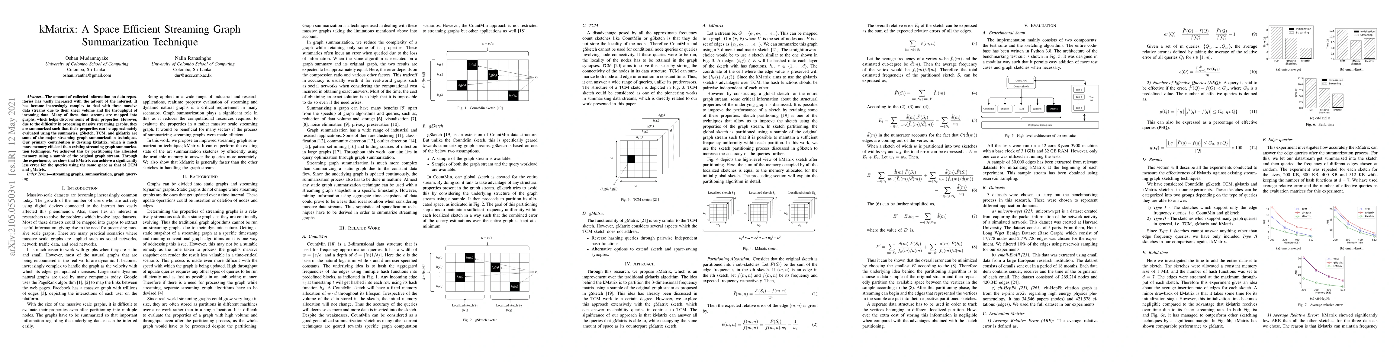 kMatrix introduces a space-efficient streaming graph summarization technique that partitions memory using a graph stream sample, achieving lower error rates compared to existing methods like TCM and gMatrix while using the same memory footprint. This innovation addresses the challenges of processing massive data streams mapped into graphs.