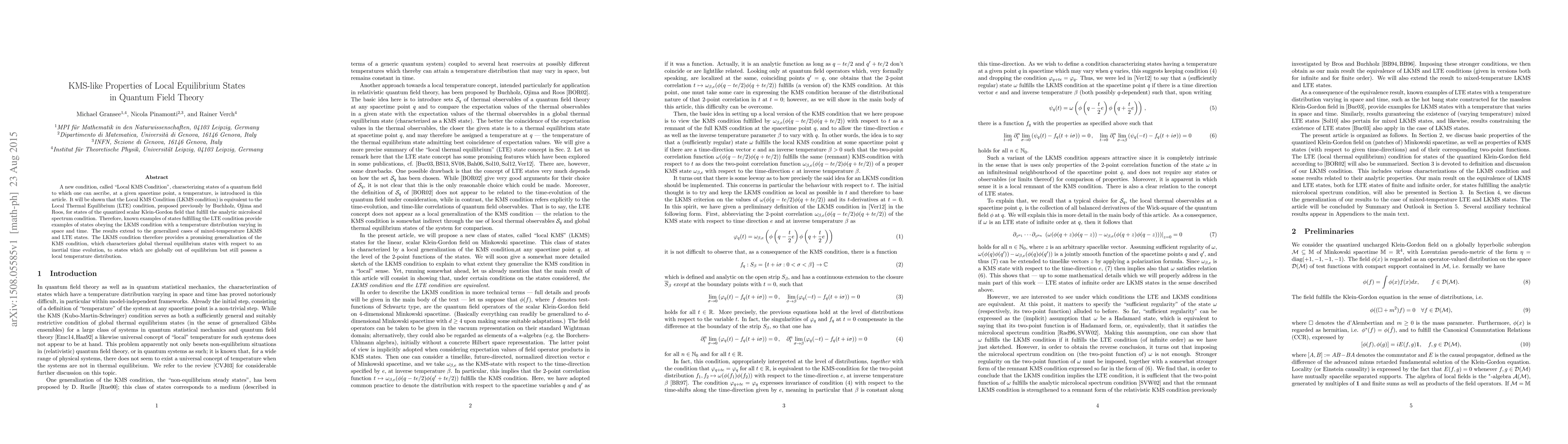 A new condition, called "Local KMS Condition", characterizing states of a quantum field to which one can ascribe, at a given spacetime point, a temperature, is introduced in this article. It will be shown that the Local KMS Condition (LKMS condition) is equivalent to the Local Thermal Equilibrium (LTE) condition, proposed previously by Buchholz, Ojima and Roos, for states of the quantized scalar Klein-Gordon field that fulfill the analytic microlocal spectrum condition. Therefore, known examples of states fulfilling the LTE condition provide examples of states obeying the LKMS condition with a temperature distribution varying in space and time. The results extend to the generalized cases of mixed-temperature LKMS and LTE states. The LKMS condition therefore provides a promising generalization of the KMS condition, which characterizes global thermal equilibrium states with respect to an inertial time evolution, to states which are globally out of equilibrium but still possess a local temperature distribution.