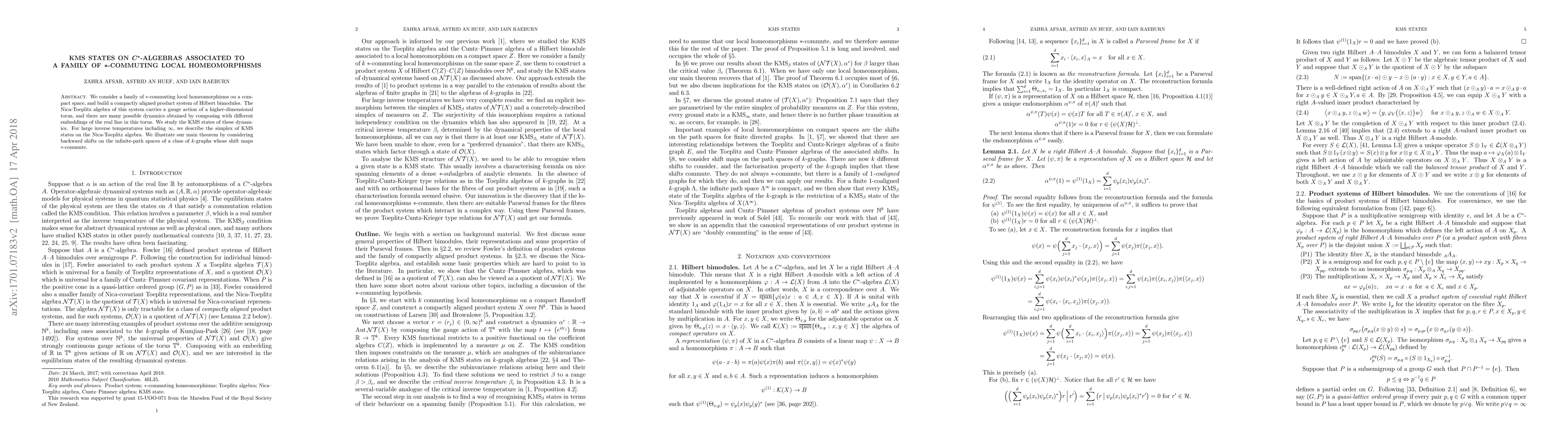 We consider a family of $*$-commuting local homeomorphisms on a compact space, and build a compactly aligned product system of Hilbert bimodules (in the sense of Fowler). This product system has a Nica-Toeplitz algebra and a Cuntz-Pimsner algebra. Both algebras carry a gauge action of a higher-dimensional torus, and there are many possible dynamics obtained by composing with different embeddings of the real line in this torus. We study the KMS states of these dynamics. For large inverse temperatures, we describe the simplex of KMS states on the Nica-Toeplitz algebra. To study KMS states for smaller inverse temperature, we consider a preferred dynamics for which there is a single critical inverse temperature. We find a KMS state on the Nica-Toeplitz algebra at this critical inverse temperature which factors through the Cuntz-Pimsner algebra. We then illustrate our results by considering backward shifts on the infinite-path spaces of a class of $k$-graphs.
