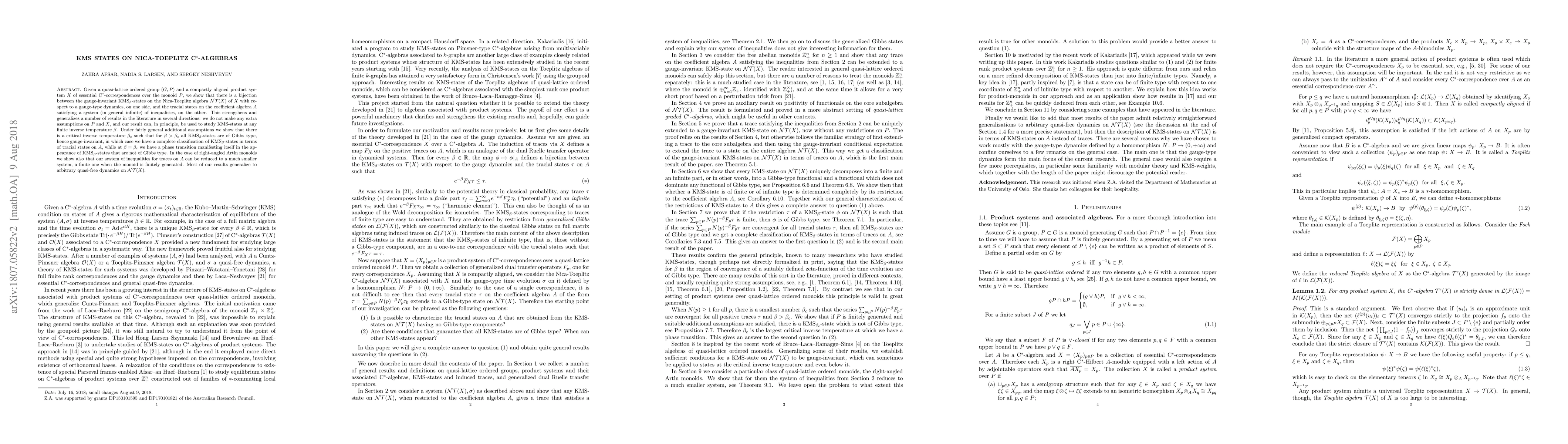 Given a quasi-lattice ordered group $(G,P)$ and a compactly aligned product system $X$ of essential C$^*$-correspondences over the monoid $P$, we show that there is a bijection between the gauge-invariant KMS$_\beta$-states on the Nica-Toeplitz algebra $\mathcal{NT}(X)$ of $X$ with respect to a gauge-type dynamics, on one side, and the tracial states on the coefficient algebra $A$ satisfying a system (in general infinite) of inequalities, on the other. This strengthens and generalizes a number of results in the literature in several directions: we do not make any extra assumptions on $P$ and $X$, and our result can, in principle, be used to study KMS-states at any finite inverse temperature $\beta$. Under fairly general additional assumptions we show that there is a critical inverse temperature $\beta_c$ such that for $\beta>\beta_c$ all KMS$_\beta$-states are of Gibbs type, hence gauge-invariant, in which case we have a complete classification of KMS$_\beta$-states in terms of tracial states on $A$, while at $\beta=\beta_c$ we have a phase transition manifesting itself in the appearance of KMS$_\beta$-states that are not of Gibbs type. In the case of right-angled Artin monoids we show also that our system of inequalities for traces on $A$ can be reduced to a much smaller system, a finite one when the monoid is finitely generated. Most of our results generalize to arbitrary quasi-free dynamics on $\mathcal{NT}(X)$.