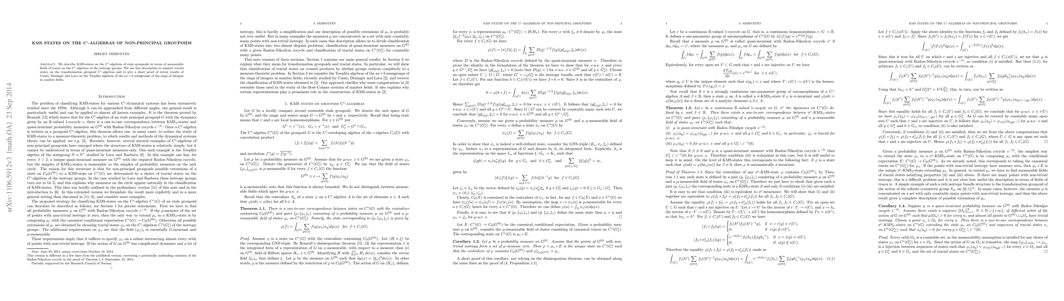 This paper describes KMS states on C*-algebras of etale groupoids in terms of measurable fields of traces on the isotropy groups' C*-algebras, providing a concise proof of recent results on Toeplitz algebras related to the ax+b semigroups in number fields.