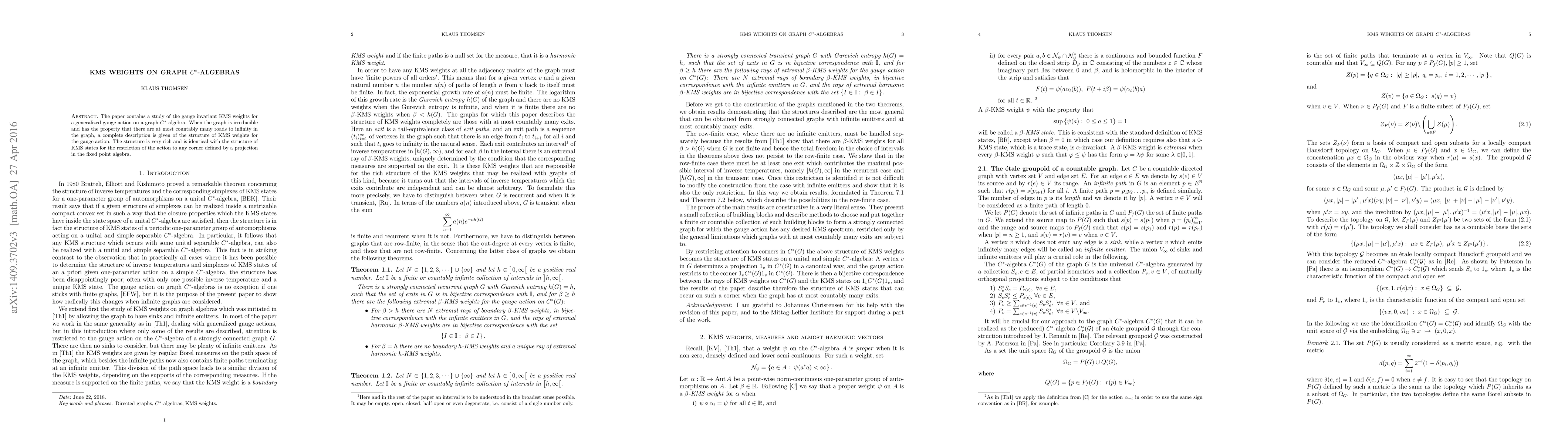 KMS weights for generalized gauge actions on graph C*-algebras are studied and a complete description of the structure is obtained for the gauge action when the graph is strongly connected and has at most countably many exits. The structure is surprisingly rich.
