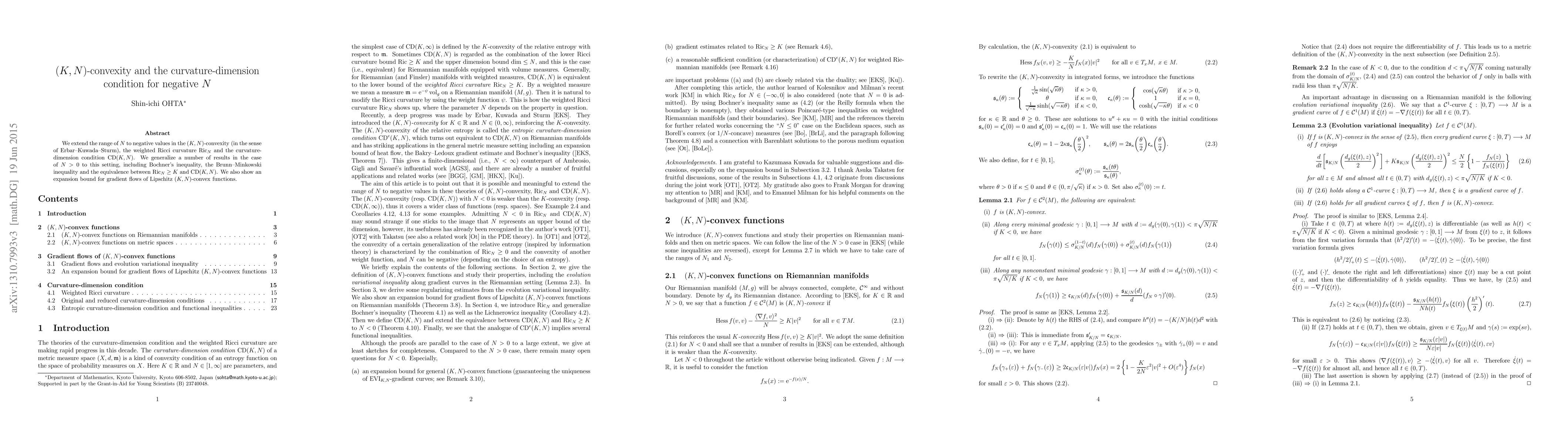 We extend the range of $N$ to negative values in the $(K,N)$-convexity (in the sense of Erbar--Kuwada--Sturm), the weighted Ricci curvature $Ric_N$ and the curvature-dimension condition $CD(K,N)$. We generalize a number of results in the case of $N>0$ to this setting, including Bochner's inequality, the Brunn--Minkowski inequality and the equivalence between $Ric_N \ge K$ and $CD(K,N)$. We also show an expansion bound for gradient flows of Lipschitz $(K,N)$-convex functions.