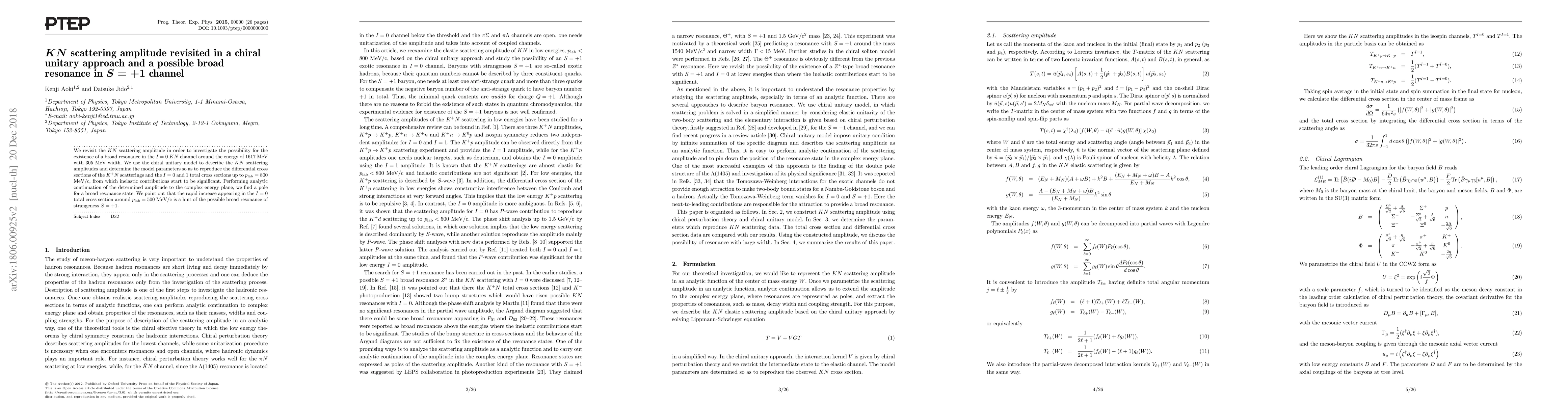 We revisit the $KN$ scattering amplitude in order to investigate the possibility for the existence of a broad resonance in the $I=0$ $KN$ channel around the energy of 1617 MeV with 305 MeV width. We use the chiral unitary model to describe the $KN$ scattering amplitudes and determine the model parameters so as to reproduce the differential cross sections of the $K^{+}N$ scatterings and the $I=0$ and 1 total cross sections up to $p_{lab} = 800$ MeV/c, from which inelastic contributions start to be significant. Performing analytic continuation of the determined amplitude to the complex energy plane, we find a pole for a broad resonance state. We point out that the rapid increase appearing in the $I=0$ total cross section around $p_{lab}=500$ MeV/c is a hint of the possible broad resonance of strangeness $S=+1$.
