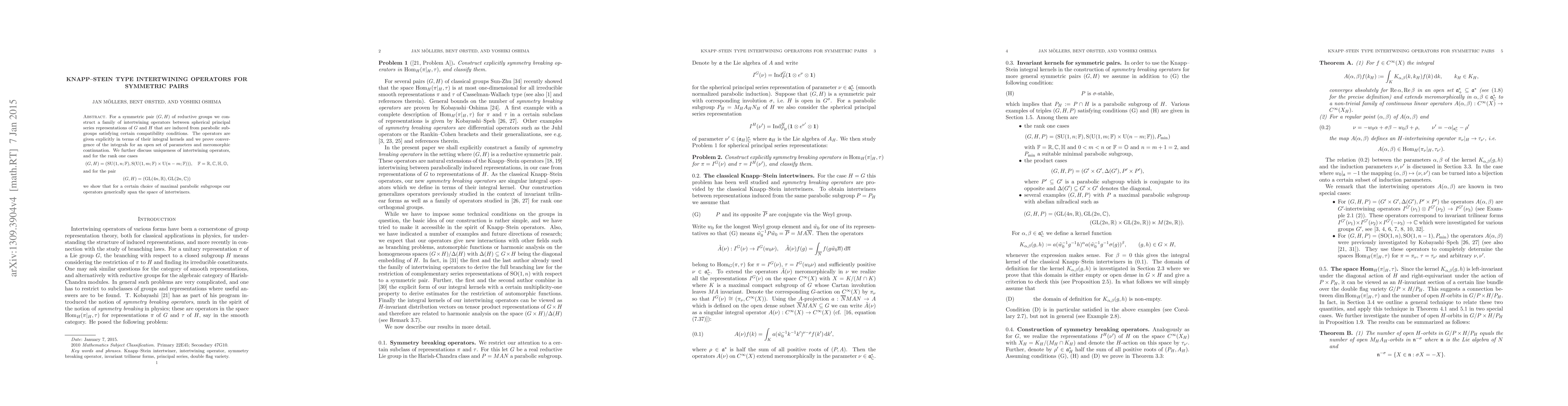 This paper constructs intertwining operators for symmetric pairs of reductive groups, providing explicit integral kernels and proving their convergence. It also discusses uniqueness and shows that for specific rank one cases, these operators generically span the space of intertwiners.