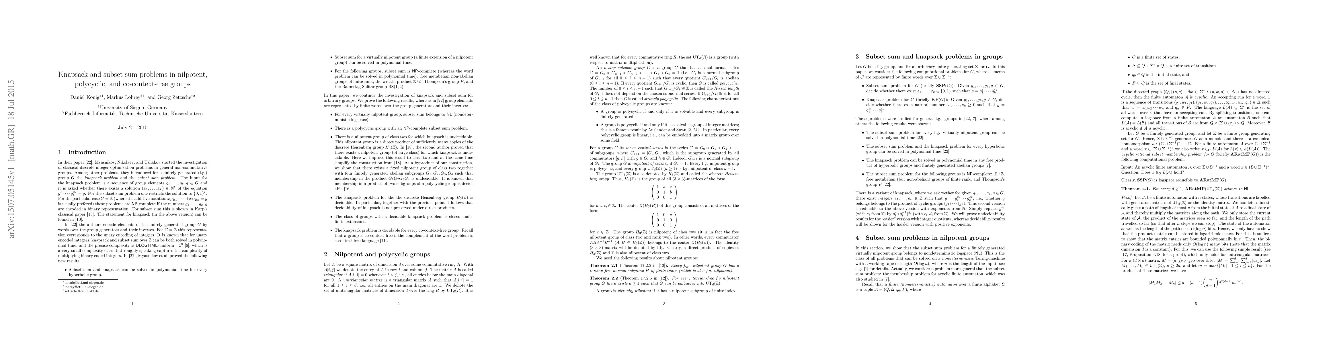 It is shown that the knapsack problem (introduced by Myasnikov, Nikolaev, and Ushakov) is undecidable in a direct product of sufficiently many copies of the discrete Heisenberg group (which is nilpotent of class 2). Moreover, for the discrete Heisenberg group itself, the knapsack problem is decidable. Hence, decidability of the knapsack problem is not preserved under direct products. It is also shown that for every co-context-free group, the knapsack problem is decidable. For the subset sum problem (also introduced by Myasnikov, Nikolaev, and Ushakov) we show that it belongs to the class NL (nondeterministic logspace) for every finitely generated virtually nilpotent group and that there exists a polycyclic group with an NP-complete subset sum problem.