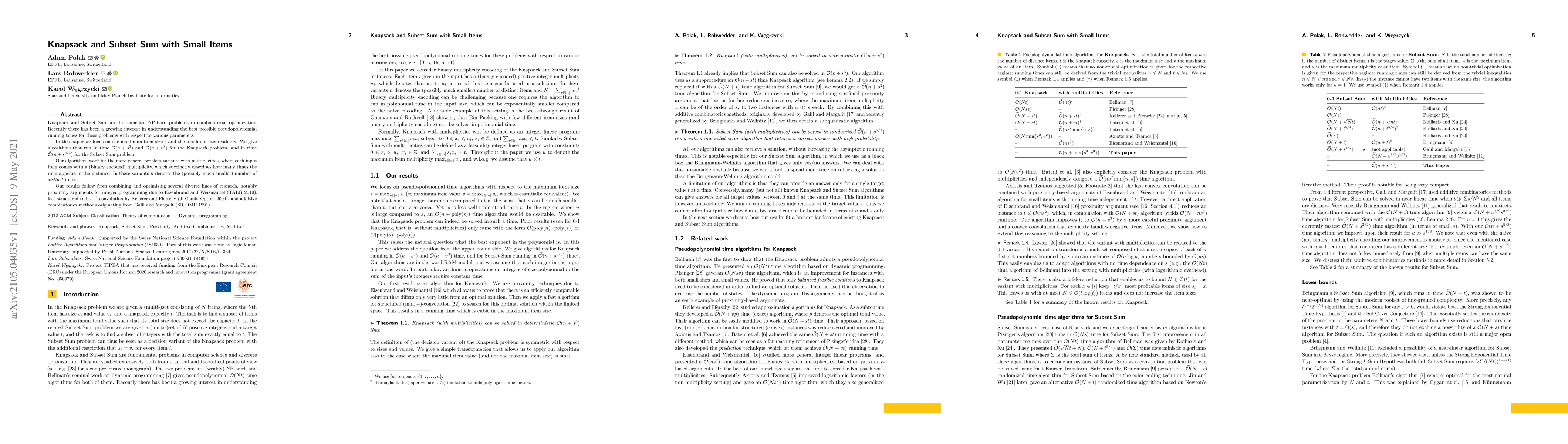This paper presents pseudopolynomial algorithms for the Knapsack and Subset Sum problems, achieving running times of $O(n + s^3)$ and $O(n + v^3)$ respectively, where $s$ and $v$ are the maximum item size and value. It also optimizes the Subset Sum algorithm to $\tilde{O}(n + s^{5/3})$ for small item sizes.