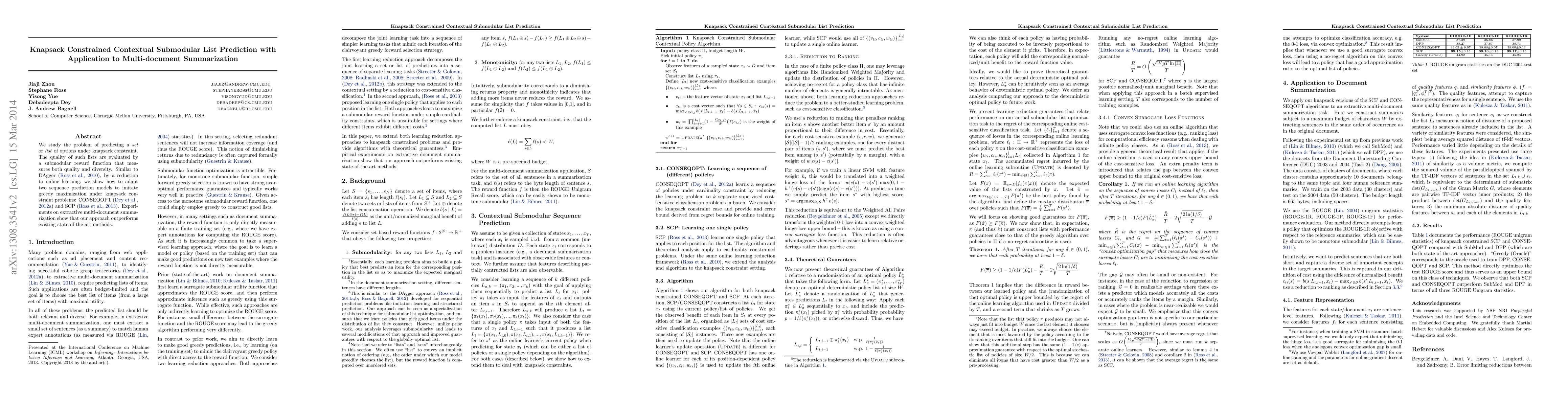 This paper addresses the knapsack constrained contextual submodular list prediction problem, adapting CONSEQOPT and SCP models to maximize a submodular reward function under constraints. Experiments demonstrate superior performance in multi-document summarization compared to existing methods.