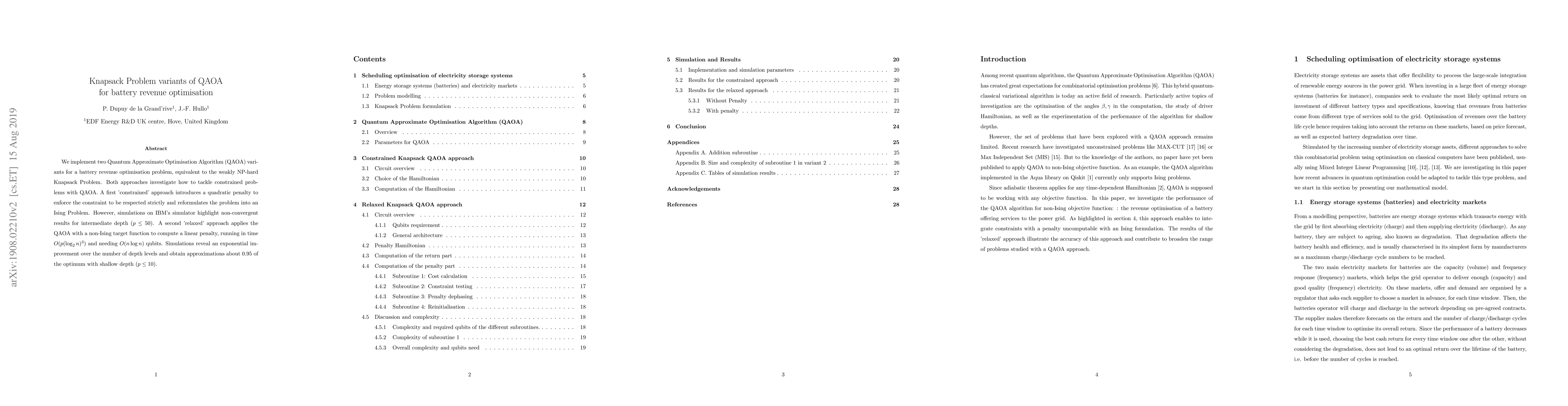 This paper explores two QAOA variants for optimizing battery revenue, akin to the Knapsack Problem. The first 'constrained' approach uses a quadratic penalty but shows non-convergence in simulations. The second 'relaxed' approach, using a linear penalty, demonstrates exponential improvement and achieves approximately 95% of the optimal solution with shallow depth.