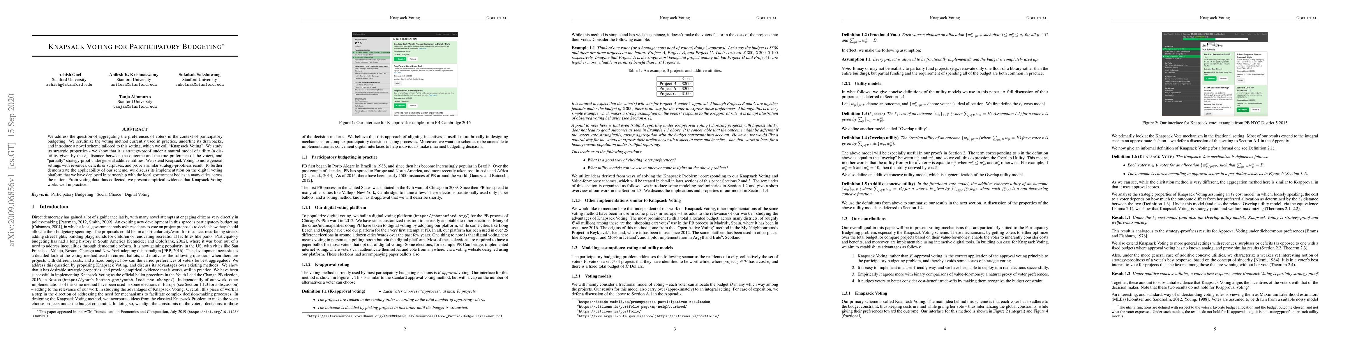 The research introduces 'Knapsack Voting' for participatory budgeting, proving its strategy-proofness under specific utility models and partial strategy-proofness under general additive utilities. The method is extended to various financial scenarios and demonstrated to work effectively in real-world implementations across multiple cities.