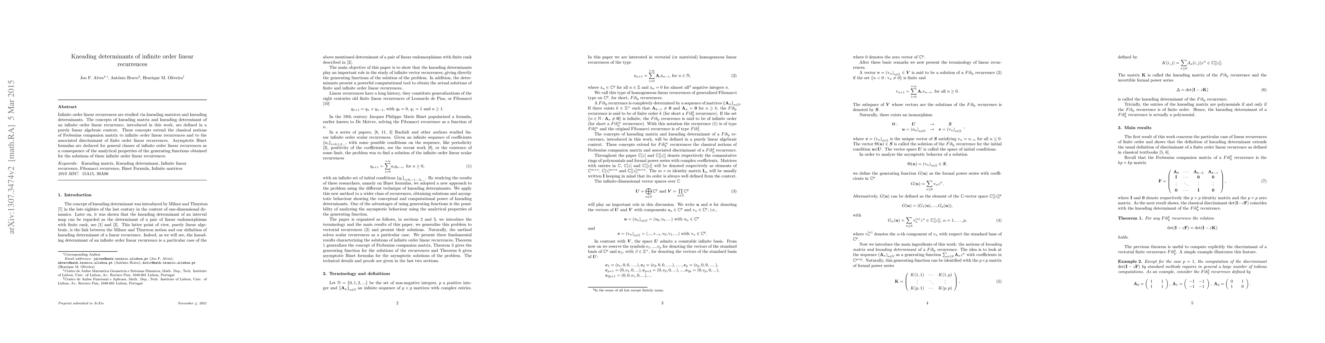 This paper introduces kneading matrices and determinants for infinite order linear recurrences, extending classical notions to this context and deriving asymptotic Binet formulas through the analytical properties of their generating functions.
