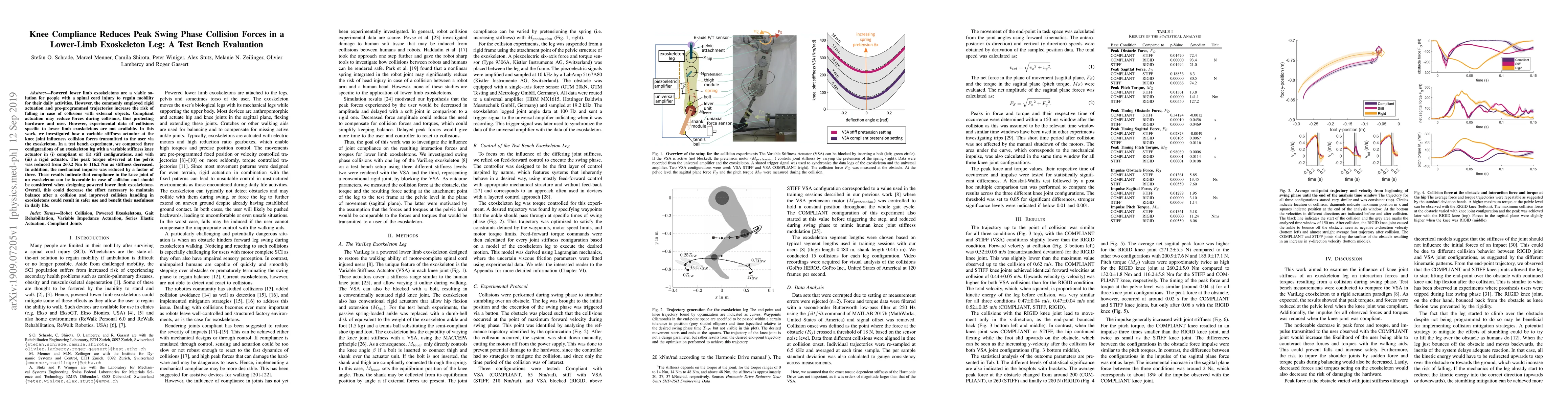 This study demonstrates that knee compliance in lower limb exoskeletons significantly reduces peak collision forces during swing phase impacts, lowering peak torque and mechanical impulse by up to 65% compared to rigid configurations. These findings suggest that incorporating compliant actuation in exoskeleton design could enhance safety and usability for users.